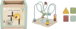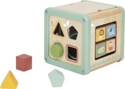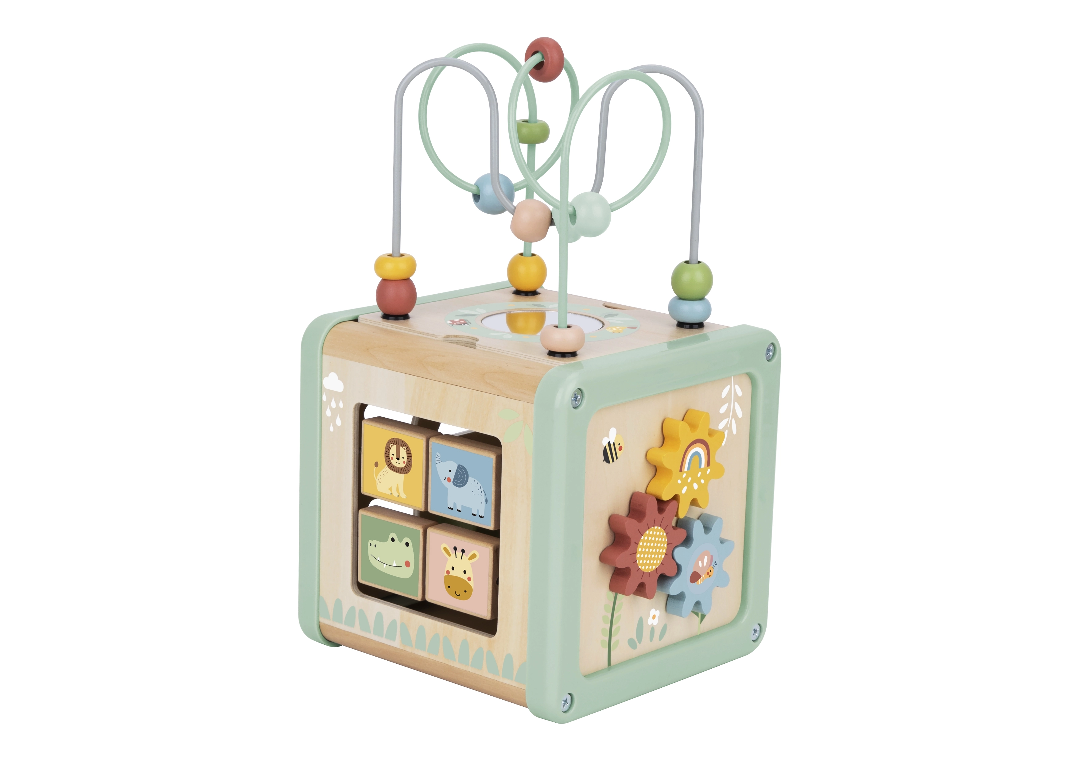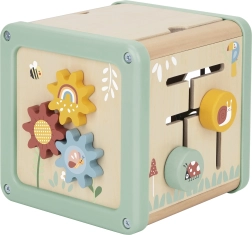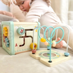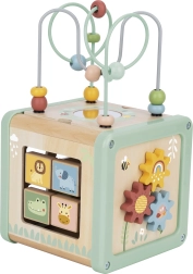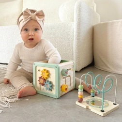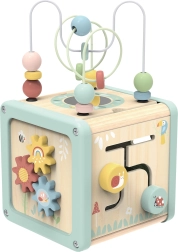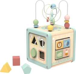 Šis daugiafunkcis medinis kubas natūraliai skatina vaiko raidą per prasmingą žaidimą. Pastelinės spalvos traukia dėmesį, o įvairi veikla lavina smulkiąją motoriką, akių–rankų koordinaciją, loginį mąstymą ir formų bei spalvų atpažinimą.