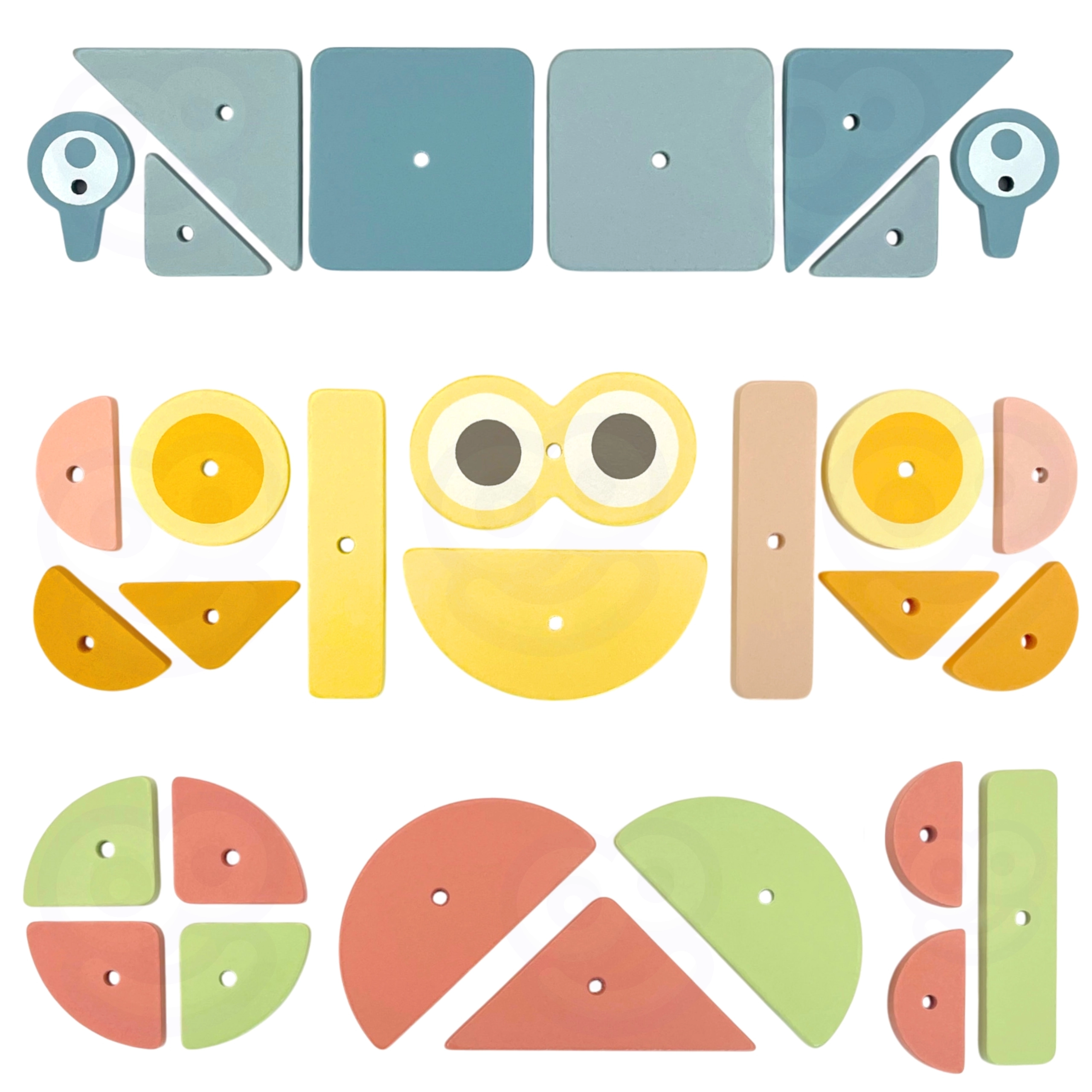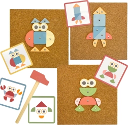 Pilnas rinkinys su medinėmis formomis, vinutėmis, plaktuku ir kamštine lenta. Vaikai gali dėlioti pagal pavyzdžius arba vadovautis savo fantazija.