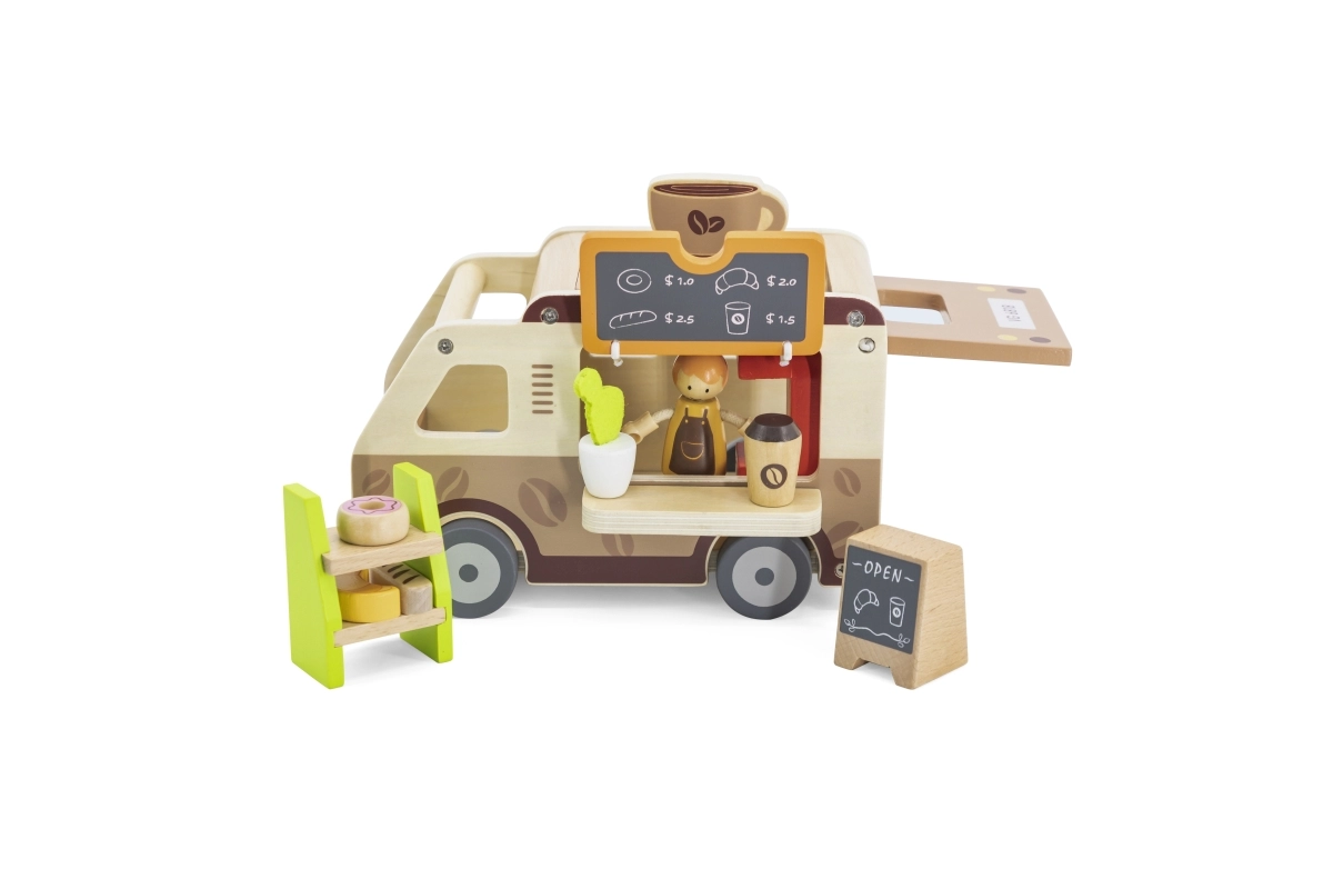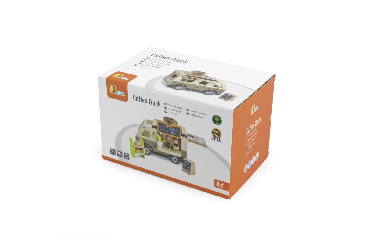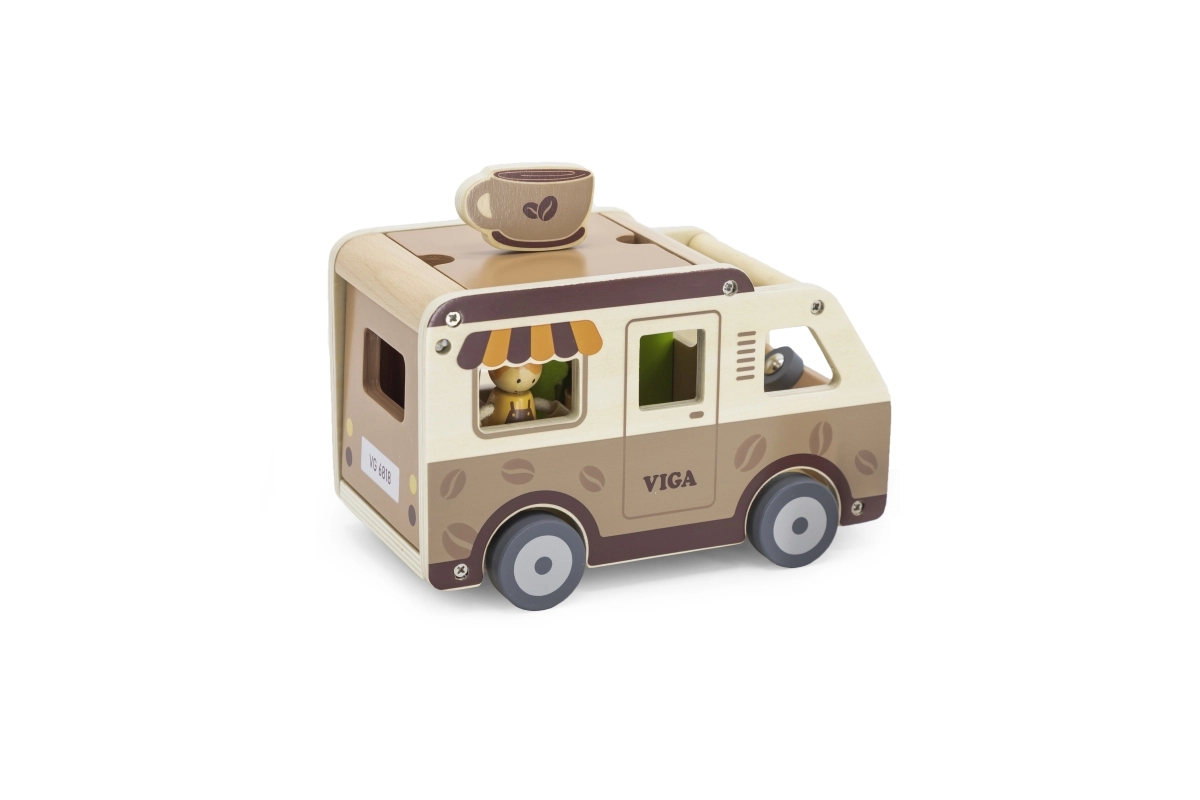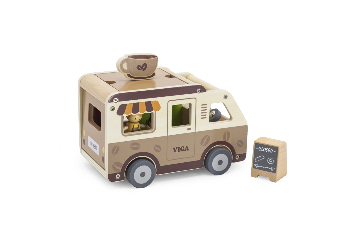 Vaikiškas medinis kavos sunkvežimis iš VIGA – apgalvotas žaislas mažiesiems vaidmenų žaidimų mėgėjams. Rinkinyje yra baristos figūrėlė, lentyna su skanumynais, gardėsiai ir įranga nuo kavos iki meniu lentos. Dėl pakeliamo stogo, aptarnavimo langelio ir atidaromo bagažo skyriaus žaisti sklandu ir panašu į tikrą klientų aptarnavimą.