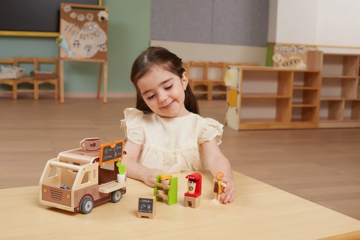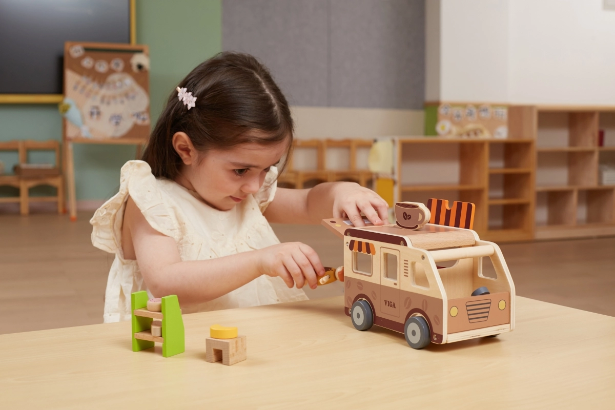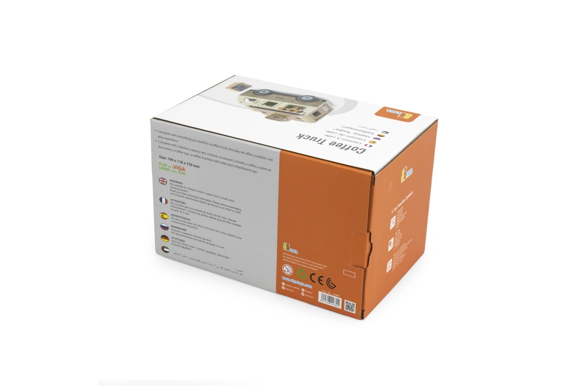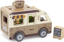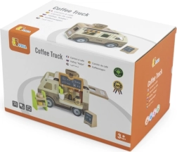 Vaikiškas medinis kavos sunkvežimis iš VIGA – apgalvotas žaislas mažiesiems vaidmenų žaidimų mėgėjams. Rinkinyje yra baristos figūrėlė, lentyna su skanumynais, gardėsiai ir įranga nuo kavos iki meniu lentos. Dėl pakeliamo stogo, aptarnavimo langelio ir atidaromo bagažo skyriaus žaisti sklandu ir panašu į tikrą klientų aptarnavimą.