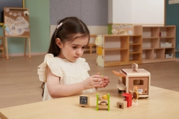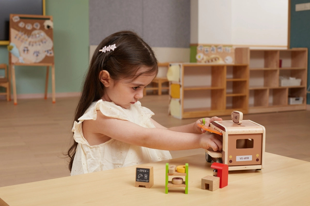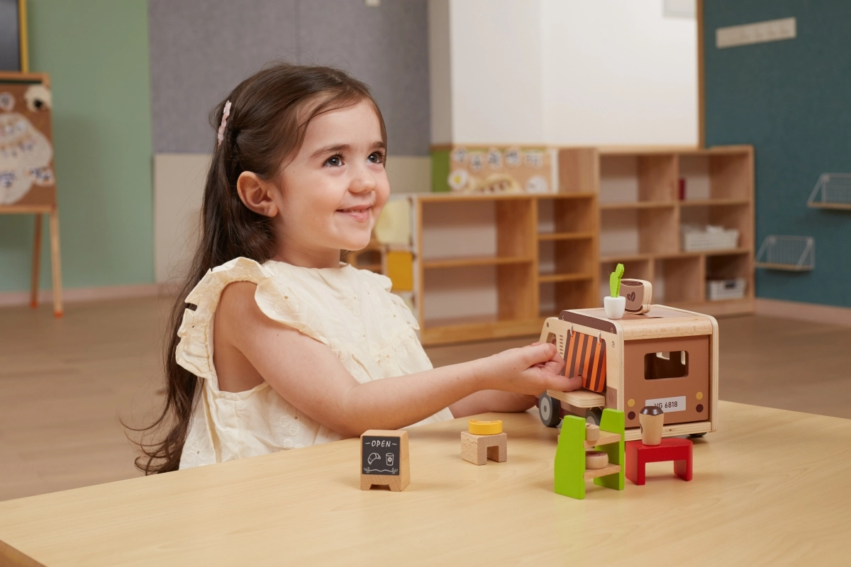Aukštos kokybės masyvi mediena ir saugios dangos užtikrina ilgaamžiškumą net kasdien žaidžiant. Rinkinys skatina socialinę sąveiką, komunikaciją ir fantazijos plėtrą – vaikai gali „virti kavą“, pardavinėti kepinius ir kurti savo kavinės istorijas.