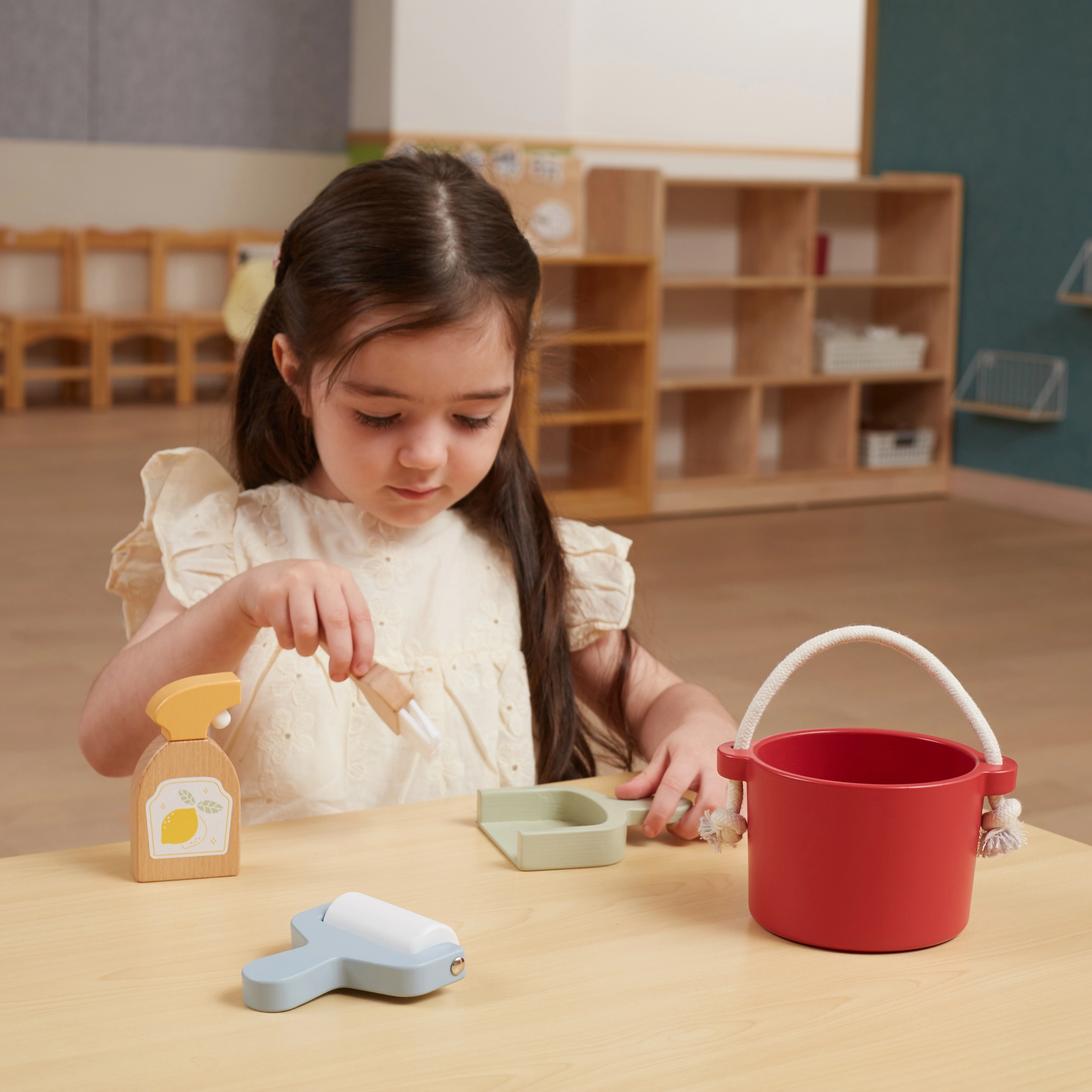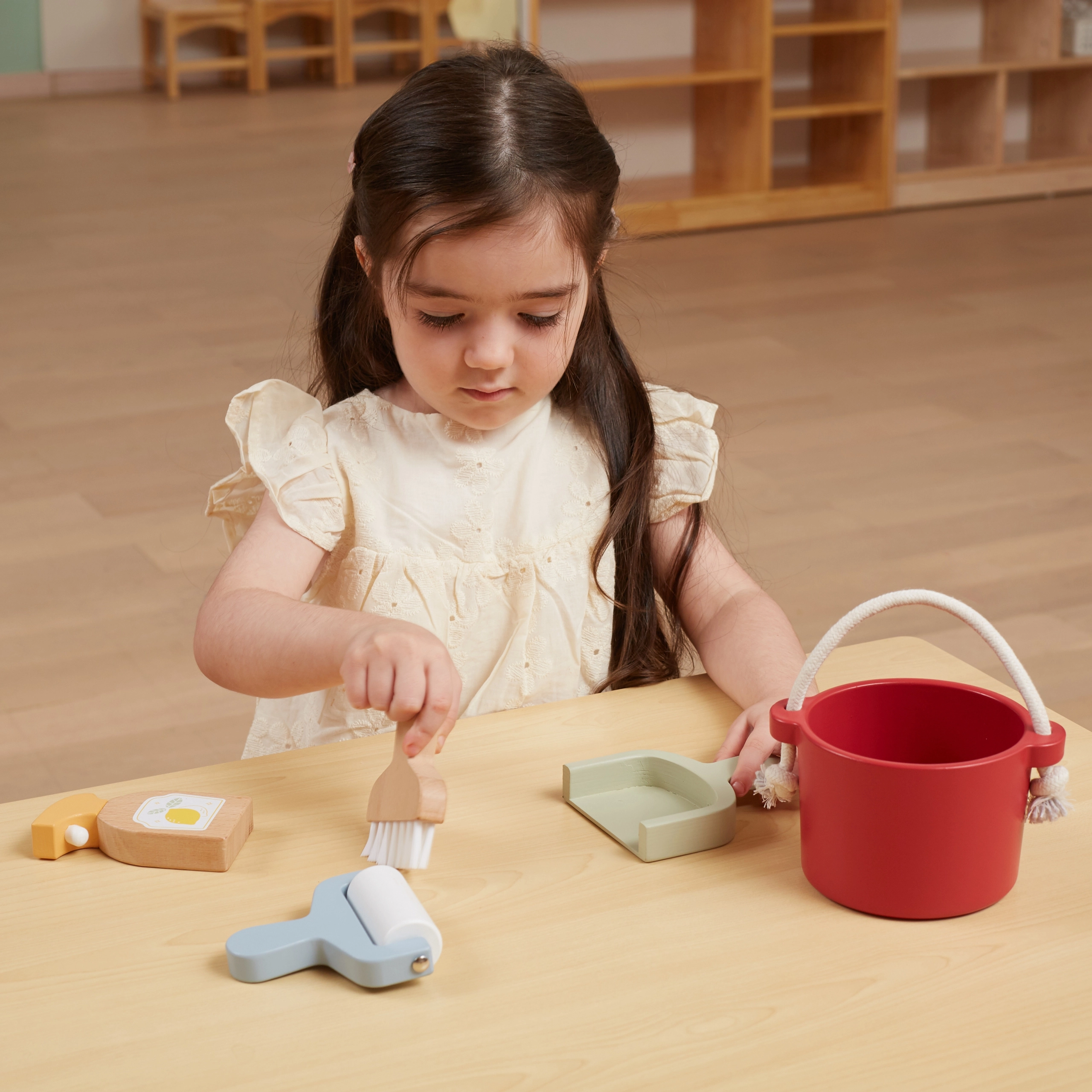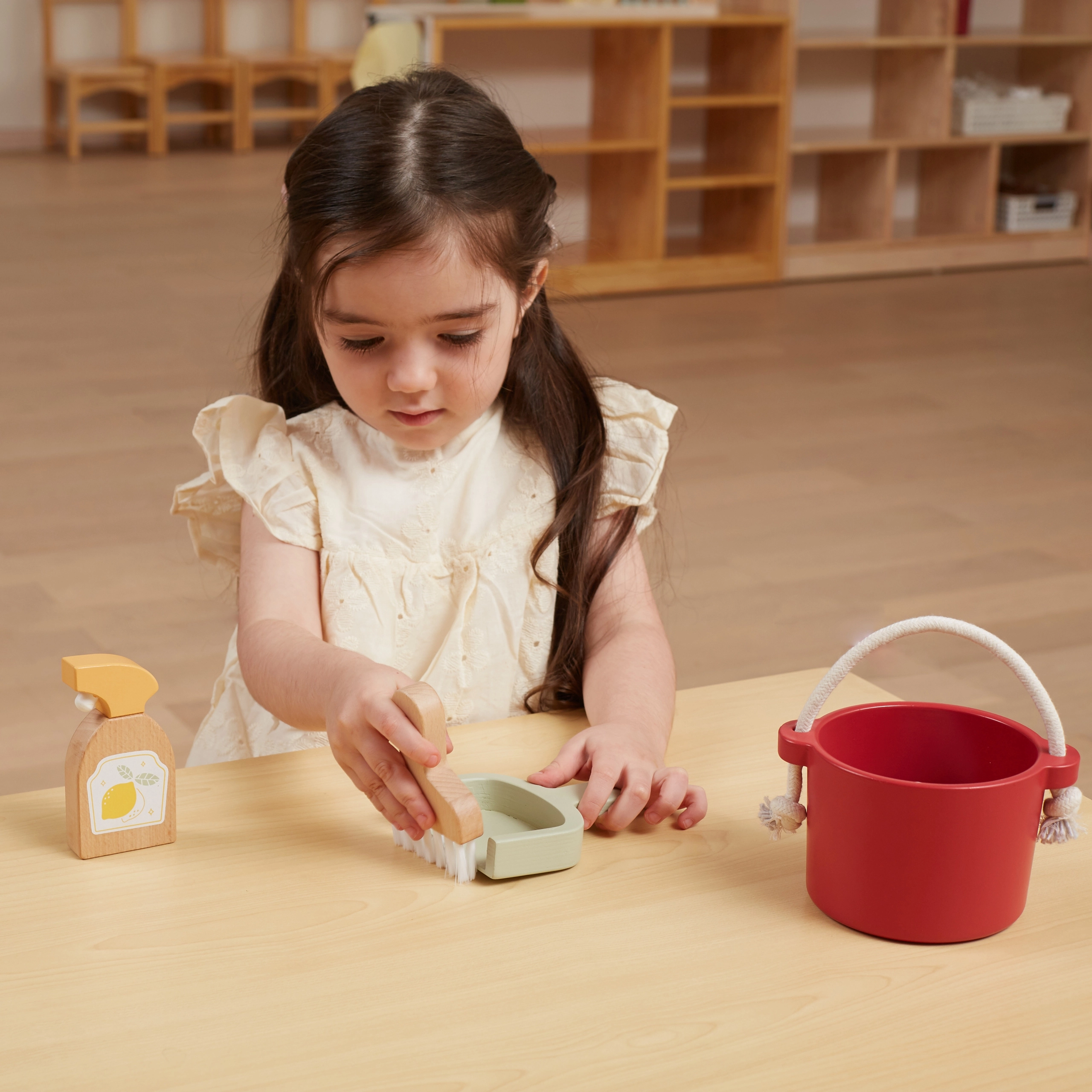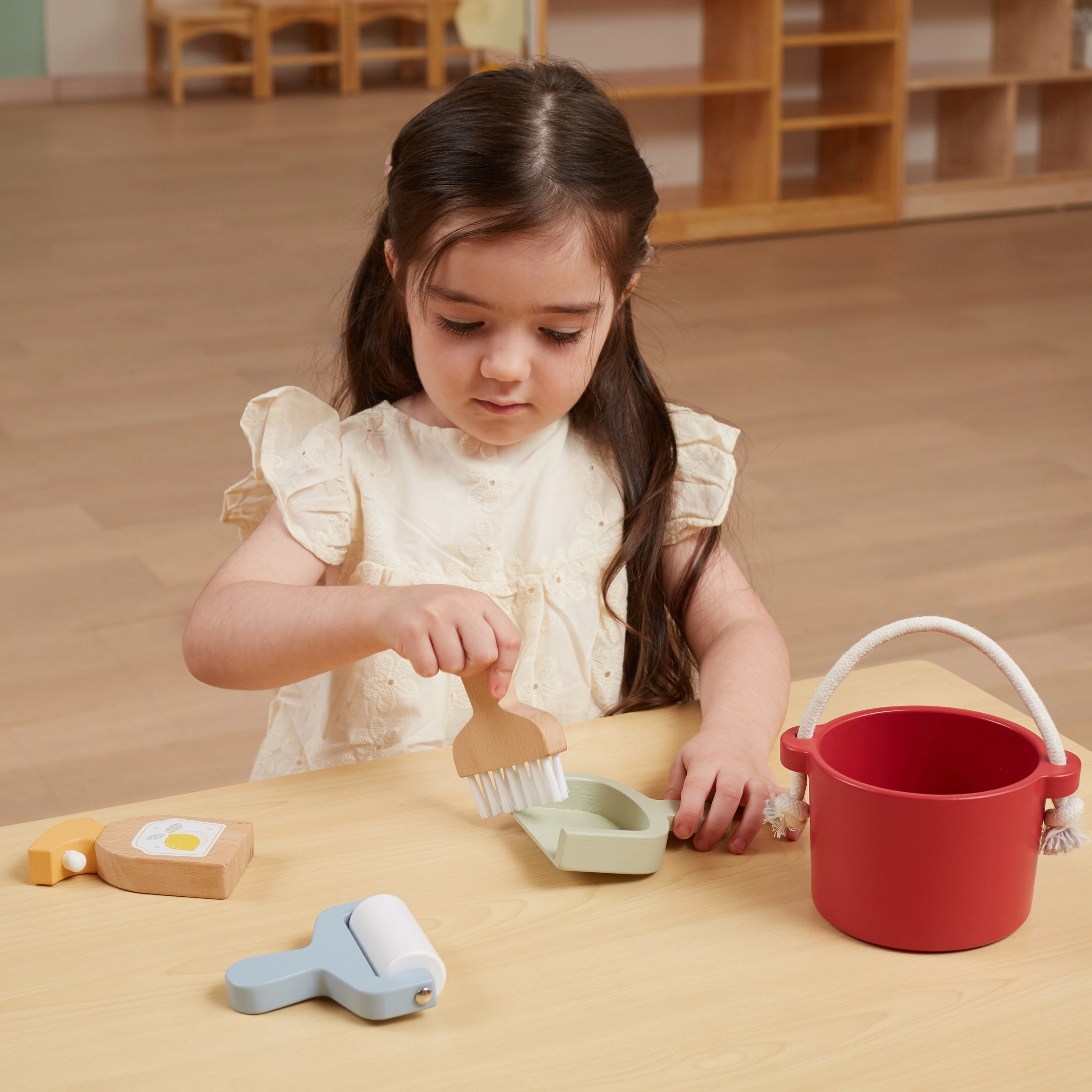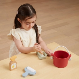 Pakuotėje rasite kibirą, šluotelę su semtuvėliu, medinį purkštuvą ir voleli̇ – viską, ko vaikui reikia „didžiam tvarkymui“. Skatina vaizduotę ir vaidmenų žaidimus.