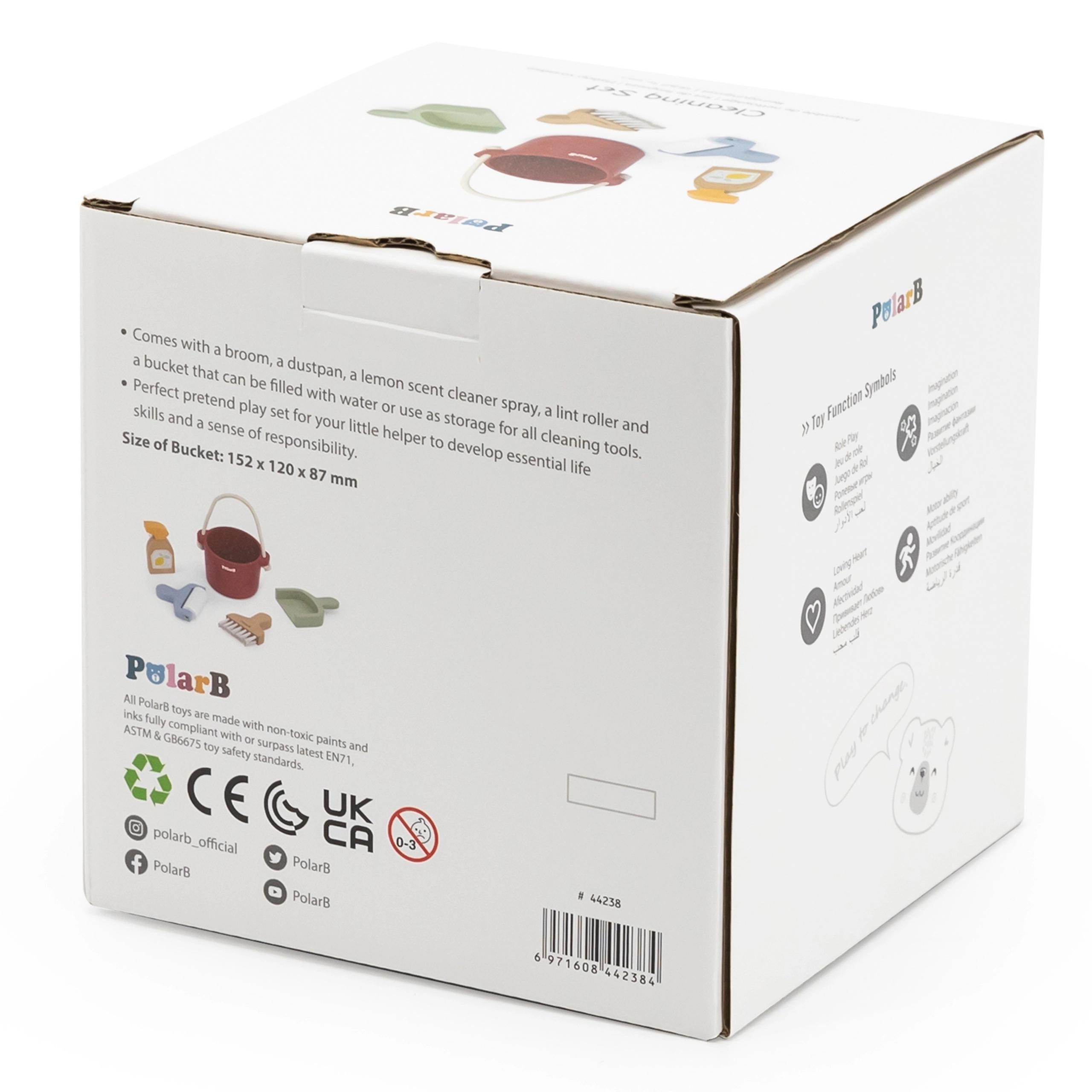 Stilingas medinis valymo rinkinys POLARB iš VIGA pavers kasdienį tvarkymą smagiu žaidimu. Jame yra viskas, ko reikia vaiko vaidmenų žaidimams – kibiras su virvine rankena, šluotelė su semtuvėliu, purkštuvas ir volelis. Žaidimas lavina smulkiąją motoriką, savarankiškumą ir tvarkos pojūtį, o kokybiškas medinis apdirbimas ir pastelinės spalvos užtikrina saugų ir patrauklų smagumą.