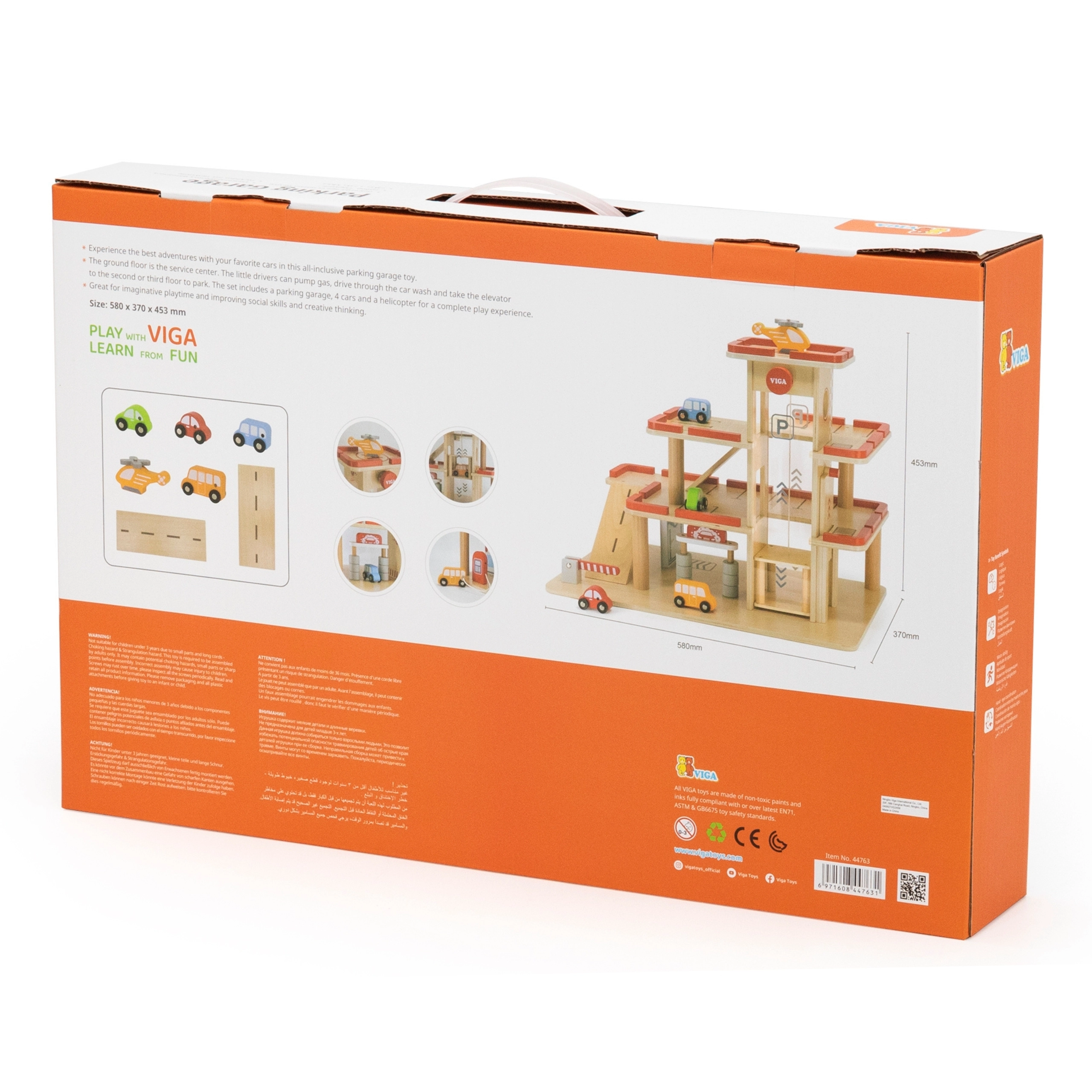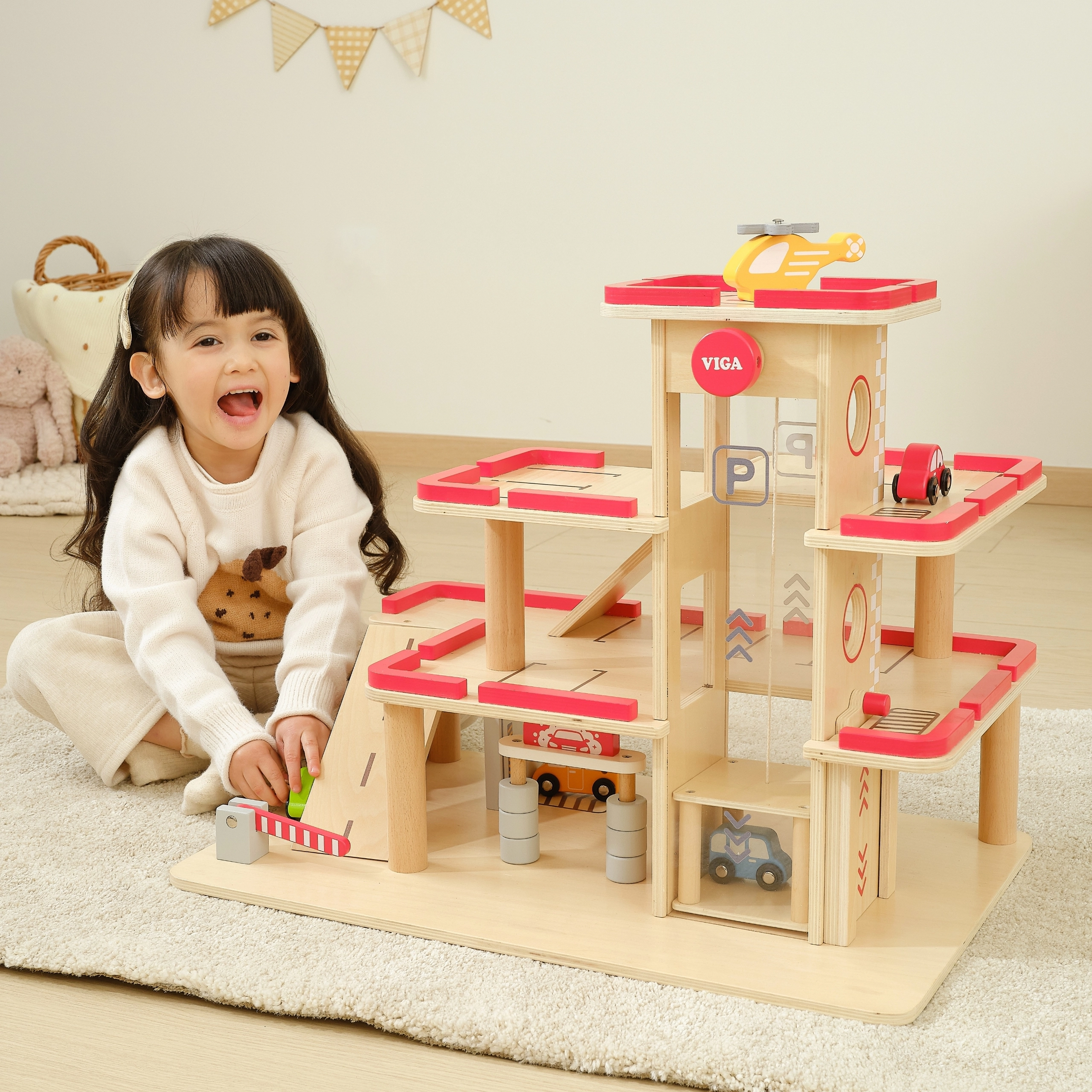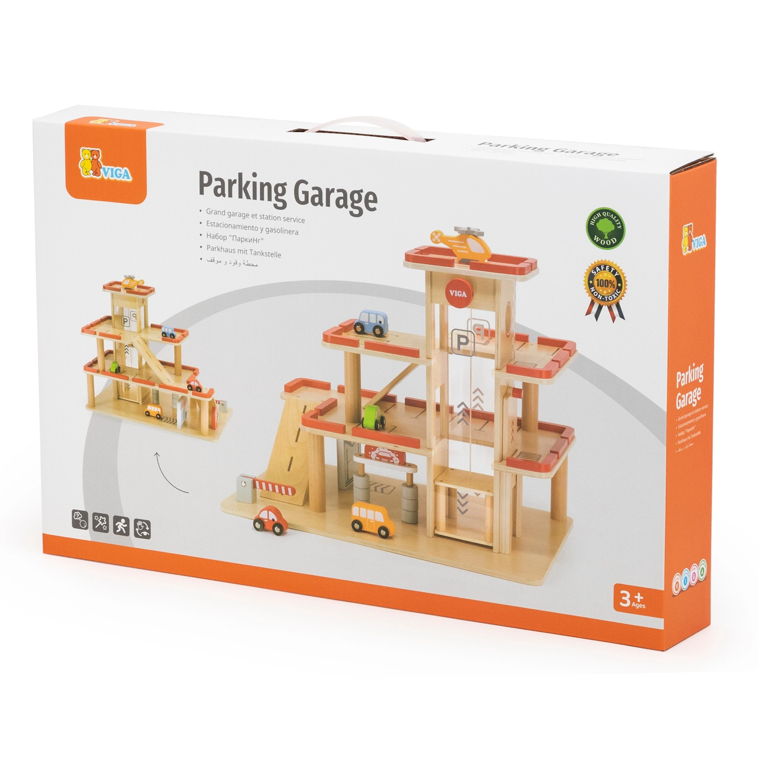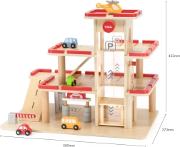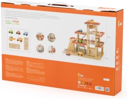 Medinis VIGA garažas puikiai tinka mažiesiems automobilių ir lėktuvų mėgėjams. Trys aukštai su rampomis, rankiniu būdu valdomas keltuvas ir sraigtasparnio nusileidimo aikštelė suteiks valandas vaizduotę skatinančio žaidimo. Dėl stabilios konstrukcijos ir kruopštaus apdirbimo rinkinys tinka tiek savarankiškam, tiek grupiniam žaidimui.