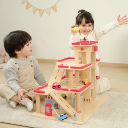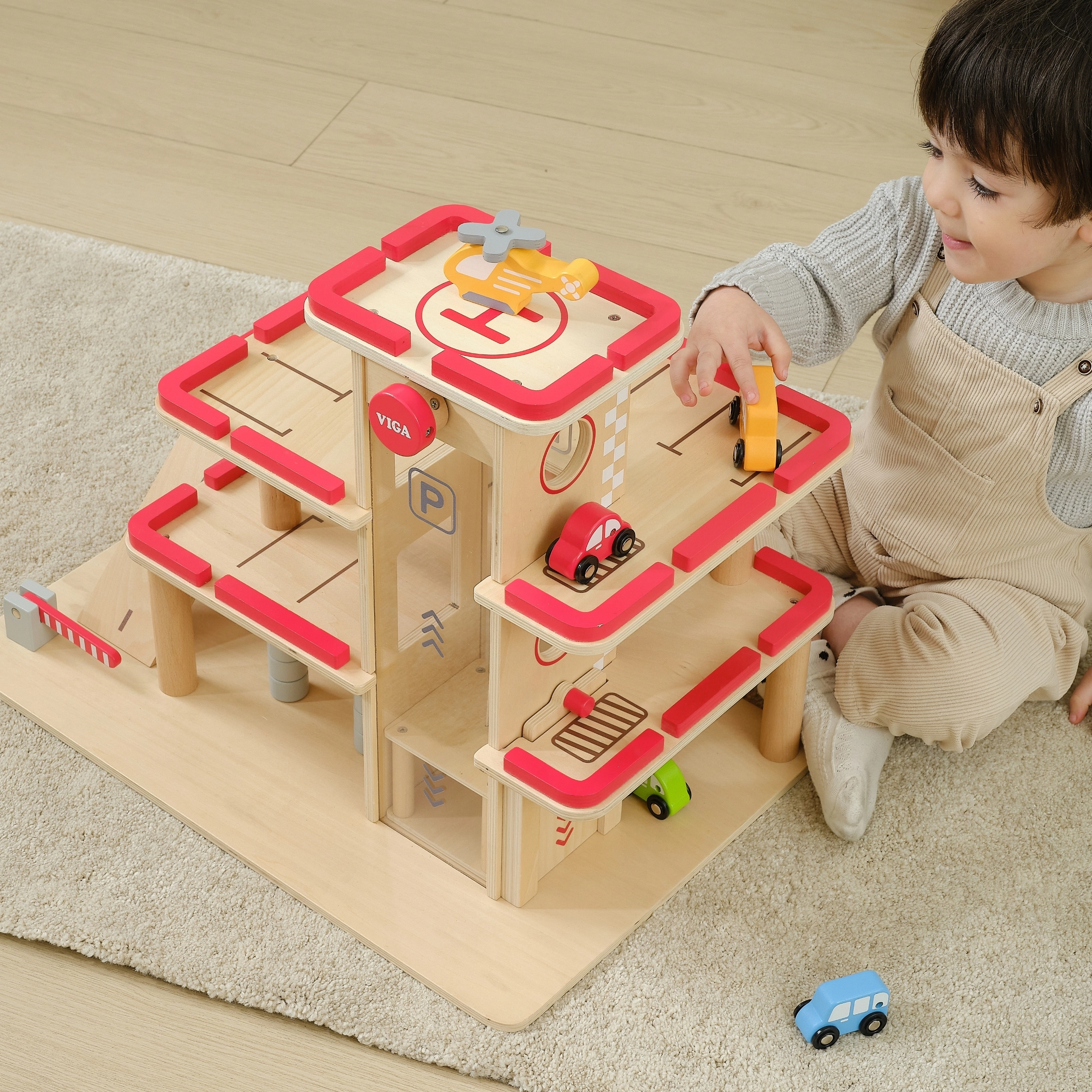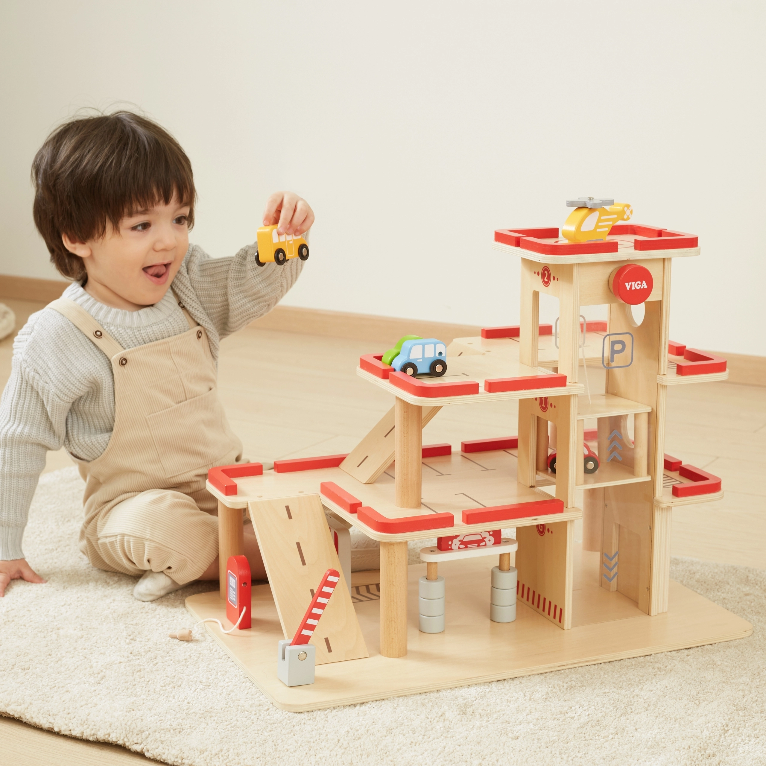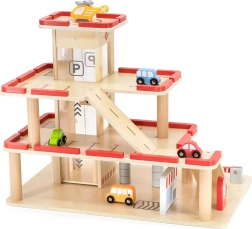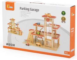 Atraskite medinį VIGA automobilių stovėjimo garažą vaikams nuo 3 metų – tvirtą trijų aukštų rinkinį su rankiniu keltuvu, plovykla ir sraigtasparnių aikštele. Komplekte yra 4 automobiliai ir sraigtasparnis, realistiškos detalės ir patvari medinė konstrukcija kūrybiškam žaidimui ir smulkiajai motorikai lavinti.