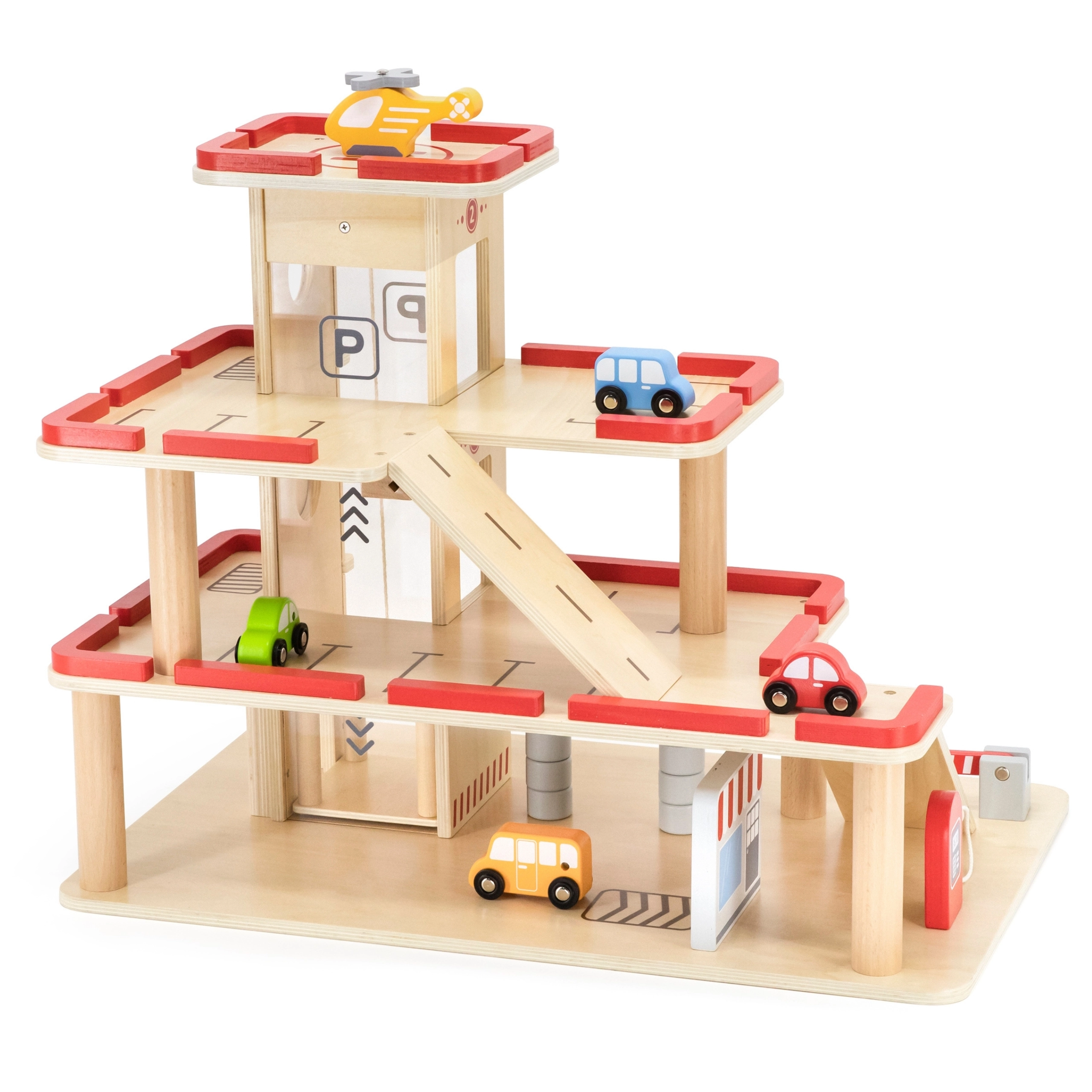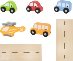 Į pakuotę įeina 4 mediniai automobiliai, sraigtasparnis ir įvažiavimo bei nusileidimo elementai. Ryškūs stovėjimo vietų žymėjimai, plovykla ir užtvarai padeda kurti realistiškus scenarijus ir moko vaikus koordinacijos įgūdžių.