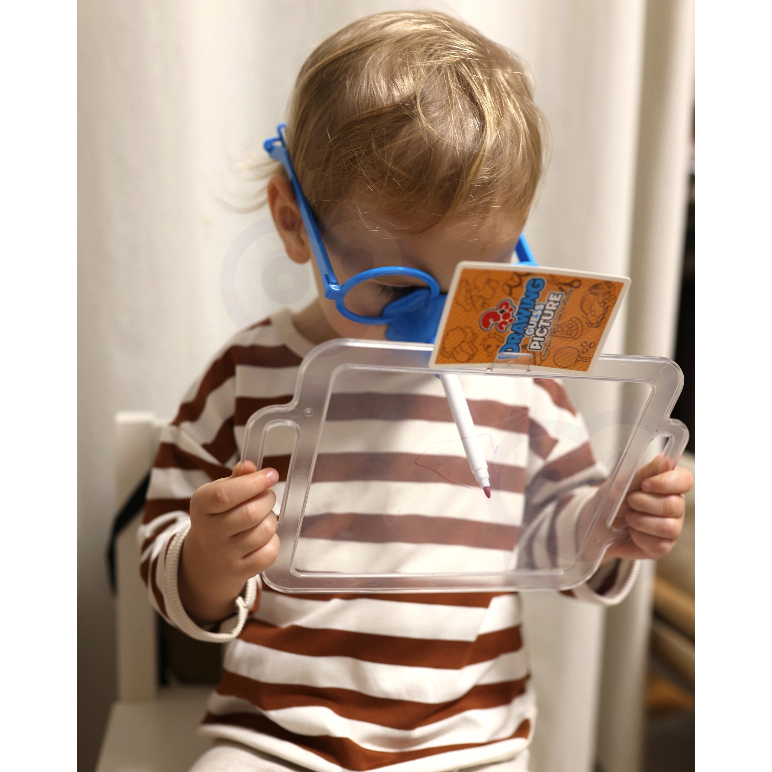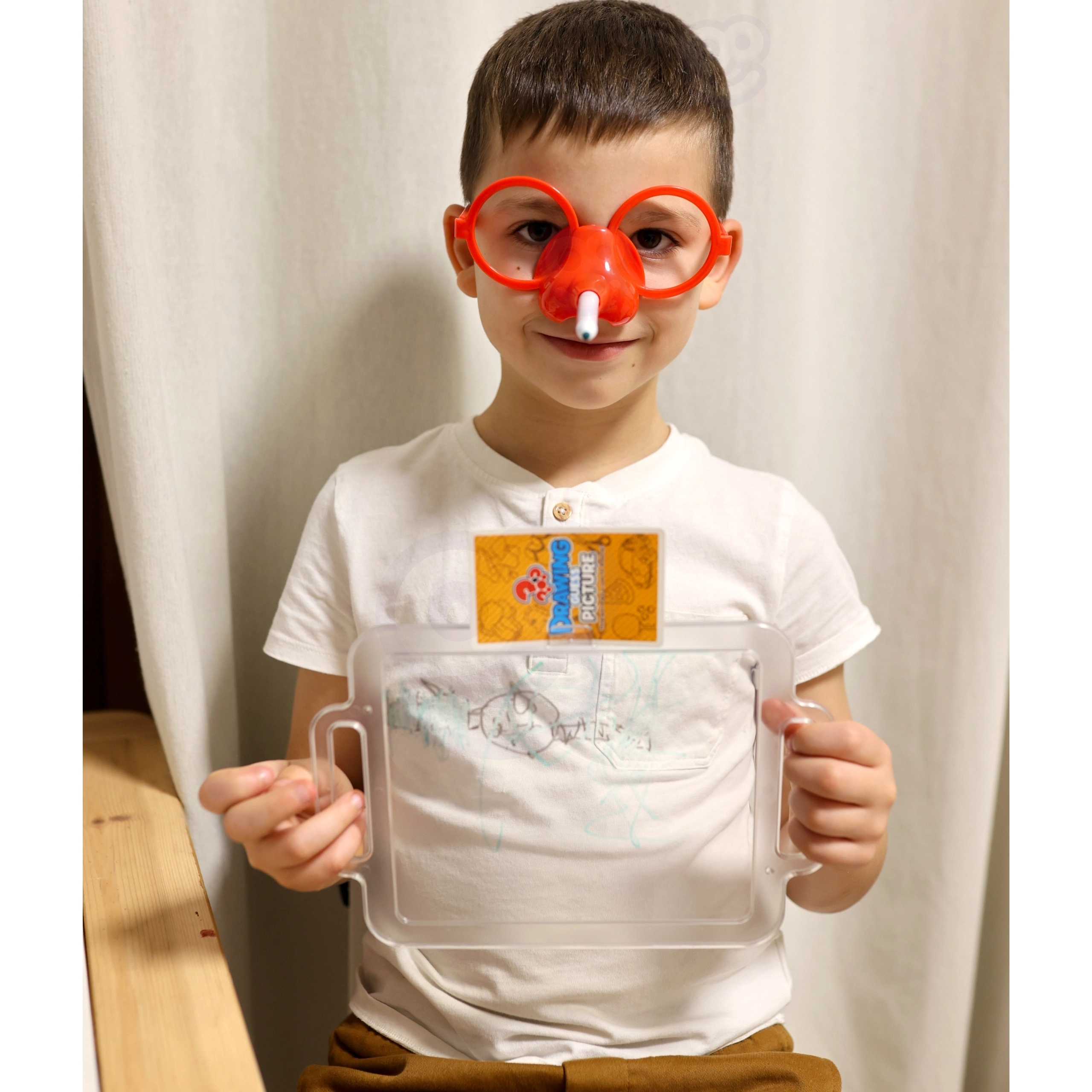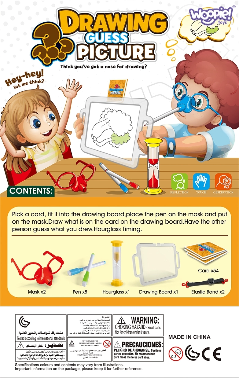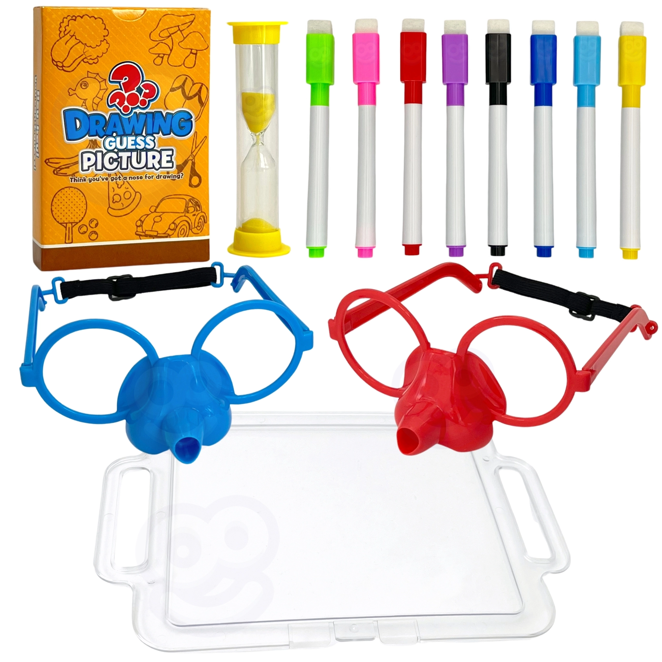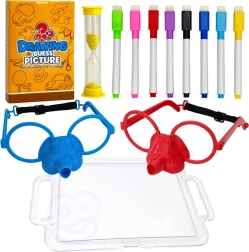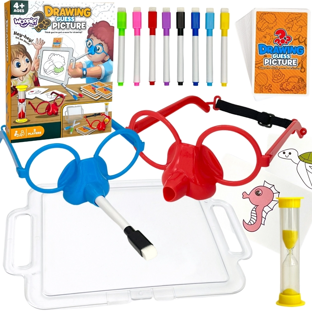 Įsivaizduokite piešimą vien tik nosimi! Su puikiu Nupiešk ir atspėk paveikslėlį žaidimu iš Woopie tai įmanoma. Užsidėkite specialius akinius su flomasteriu ir ant lentos nupieškite atsitiktinai ištrauktą paveikslėlį, kad padėtumėte savo komandai atspėti žodžius. Laikas senka, tad paskubėkite – smėlio laikrodis jau tiksėja!