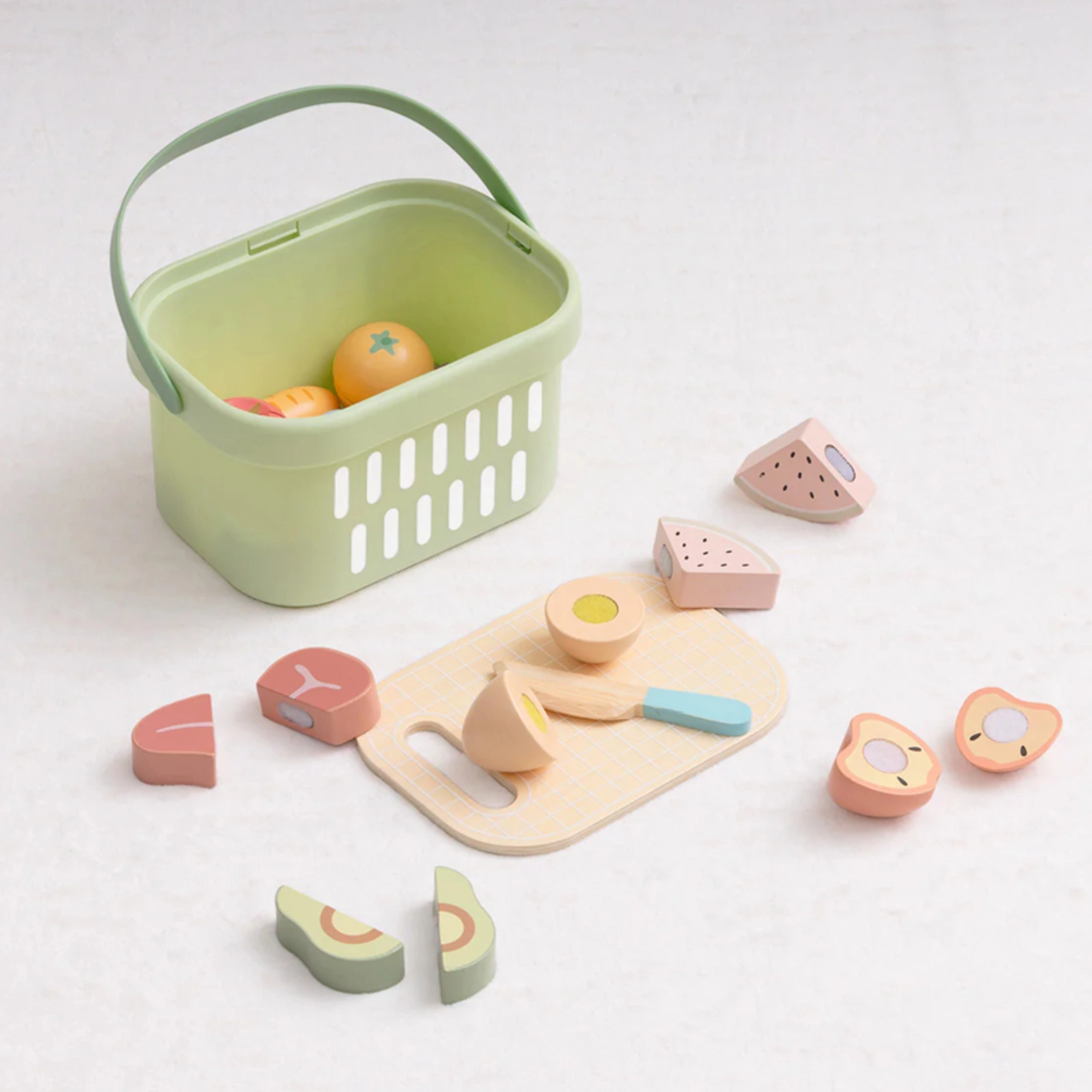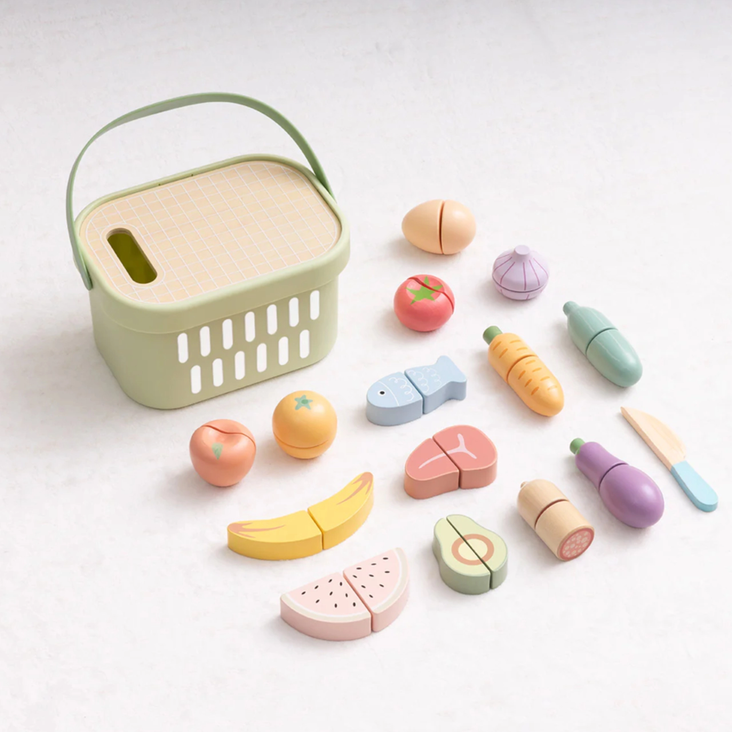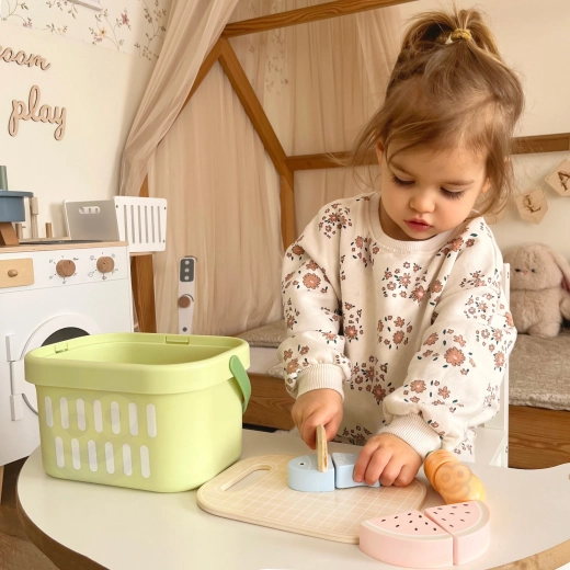 Medinis TOOKY TOY maisto rinkinys yra idealus mažajai namų virtuvėlei. Pasteliniai vaisiai ir daržovės, žuvis, kepsnys, sūris ar kiaušinis yra padalinti į dalis ir sujungti lipniu segtuku – vaikai gali juos saugiai „pjaustyti“ mediniu peiliu ant pridėtos lentelės ir vėl sujungti. Viską galima sudėti į lengvą krepšelį, todėl rinkinį patogu nešiotis ir lengva palaikyti tvarką.