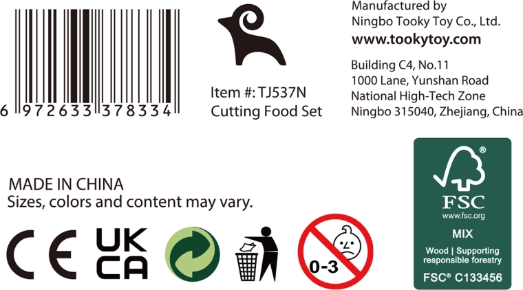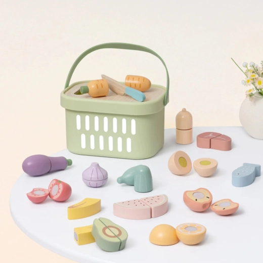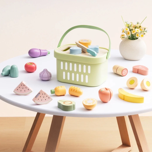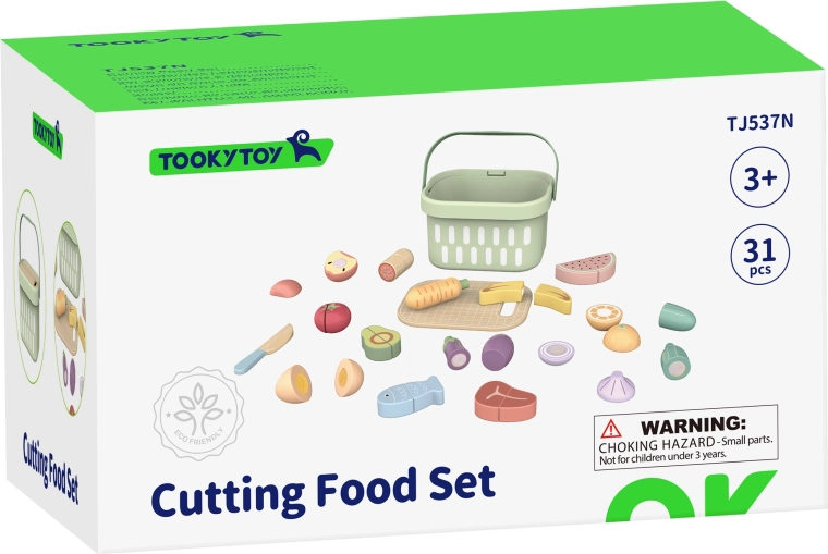 Suteikite vaikams smagaus „virimo“ su mediniu TOOKY TOY maisto rinkiniu. Jame yra 31 dalis, įskaitant vaisius, daržoves, žuvį, kiaušinį, pjaustymo lentelę ir peilį bei patogų krepšelį laikymui. Dalys sujungiamos lipniu segtuku (Velcro) arba magnetu ir gali būti vėl ir vėl „pjaustomos“. Skatina smulkiąją motoriką, kūrybiškumą ir vaidmenų žaidimus, taip pat moko vaikus apie sveiką mitybą.