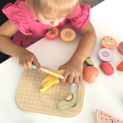 Vaisių ir daržovių dalys yra segmentuotos ir sujungtos lipniu segtuku. Vaikai gali jas pakartotinai „pjaustyti“ mediniu peiliu ant lentelės ir vėl sujungti.