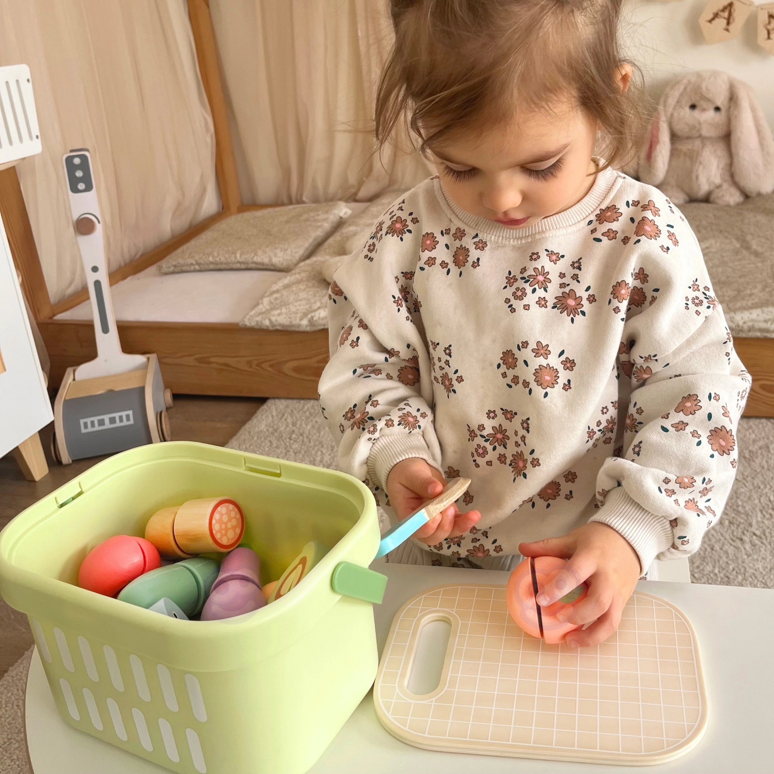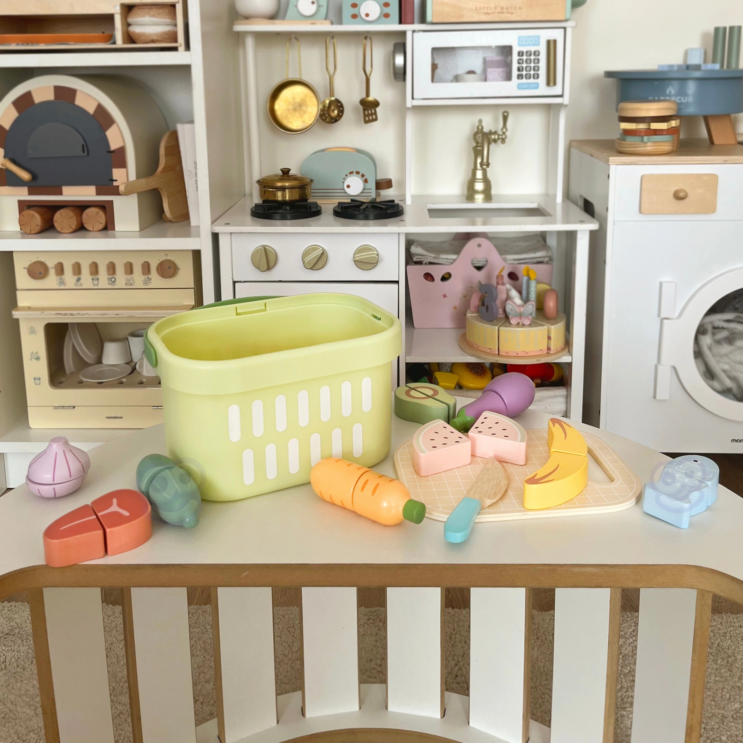 Krepšelis, pjaustymo lentelė, peilis ir platus maisto produktų pasirinkimas suteikia viską, ko reikia „virimui“, serviravimui ir mokymuisi apie sveiką mitybą.