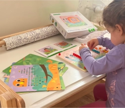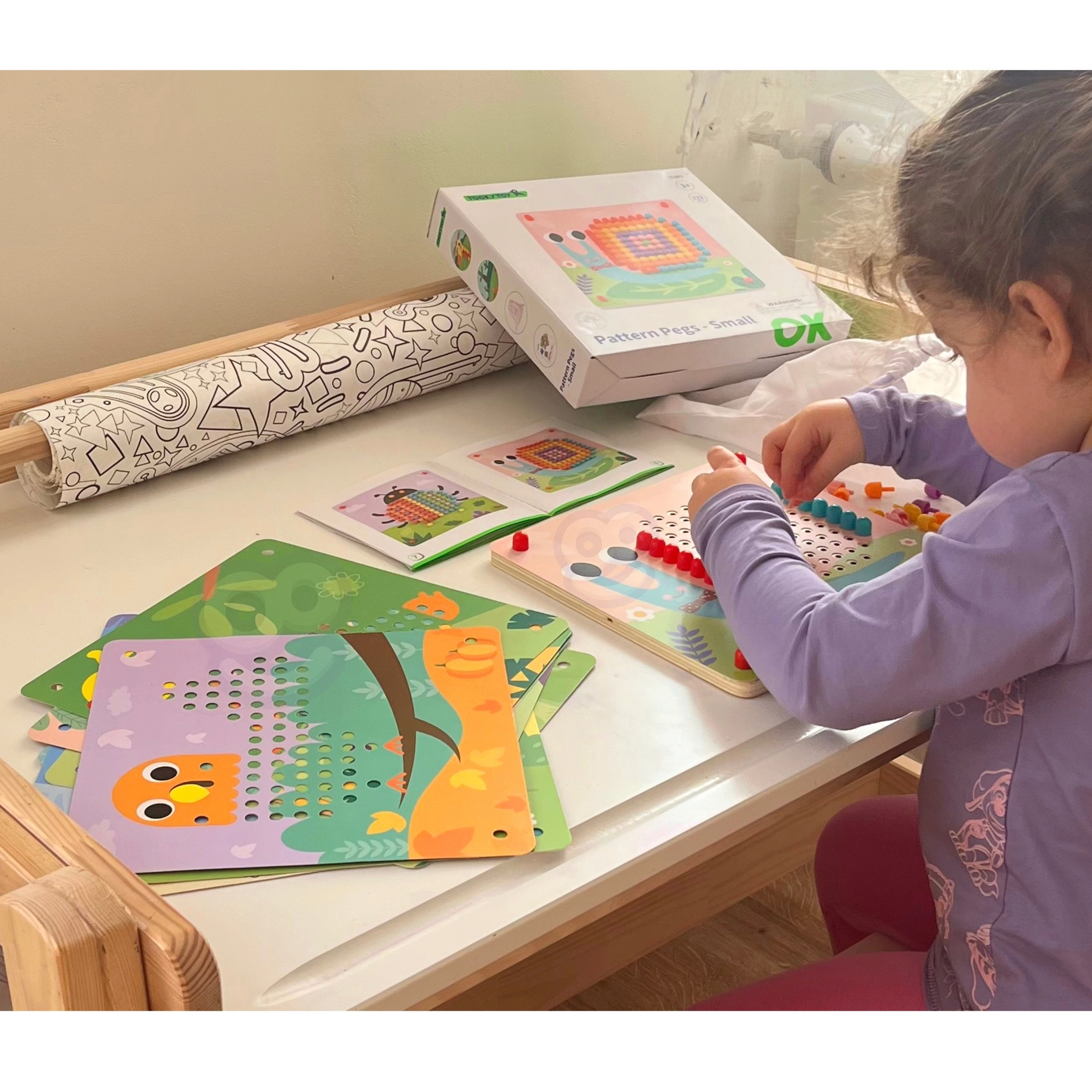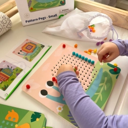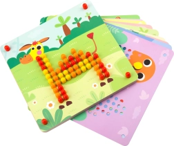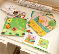 Rinkinyje yra 10 šablonų, 222 spalvoti kaištukai ir medžiaginis maišelis patogiam laikymui.