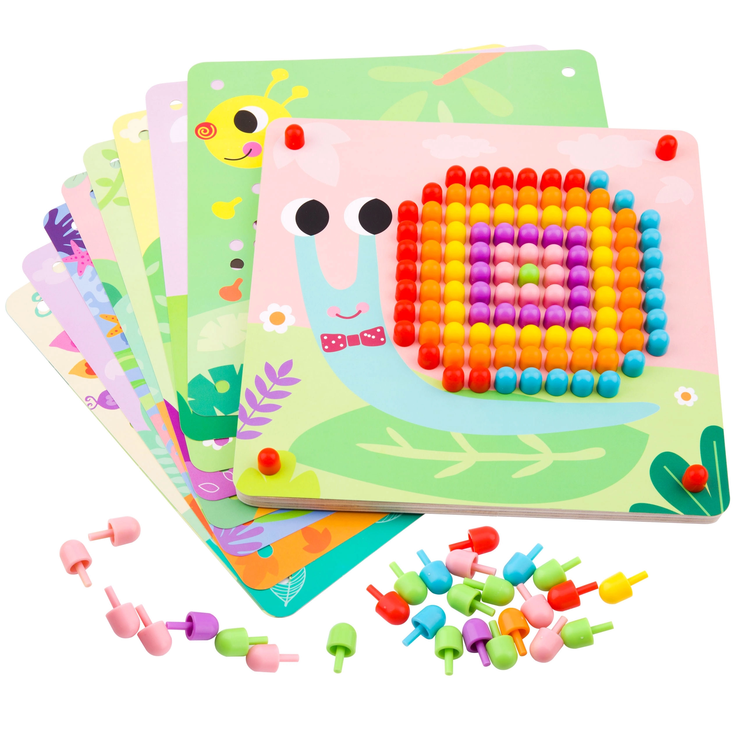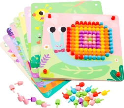 Medinė mozaika su spalvingais kaištukais ir linksmomis iliustracijomis teikia daug džiaugsmo ir skatina vaikų kūrybinį tobulėjimą.