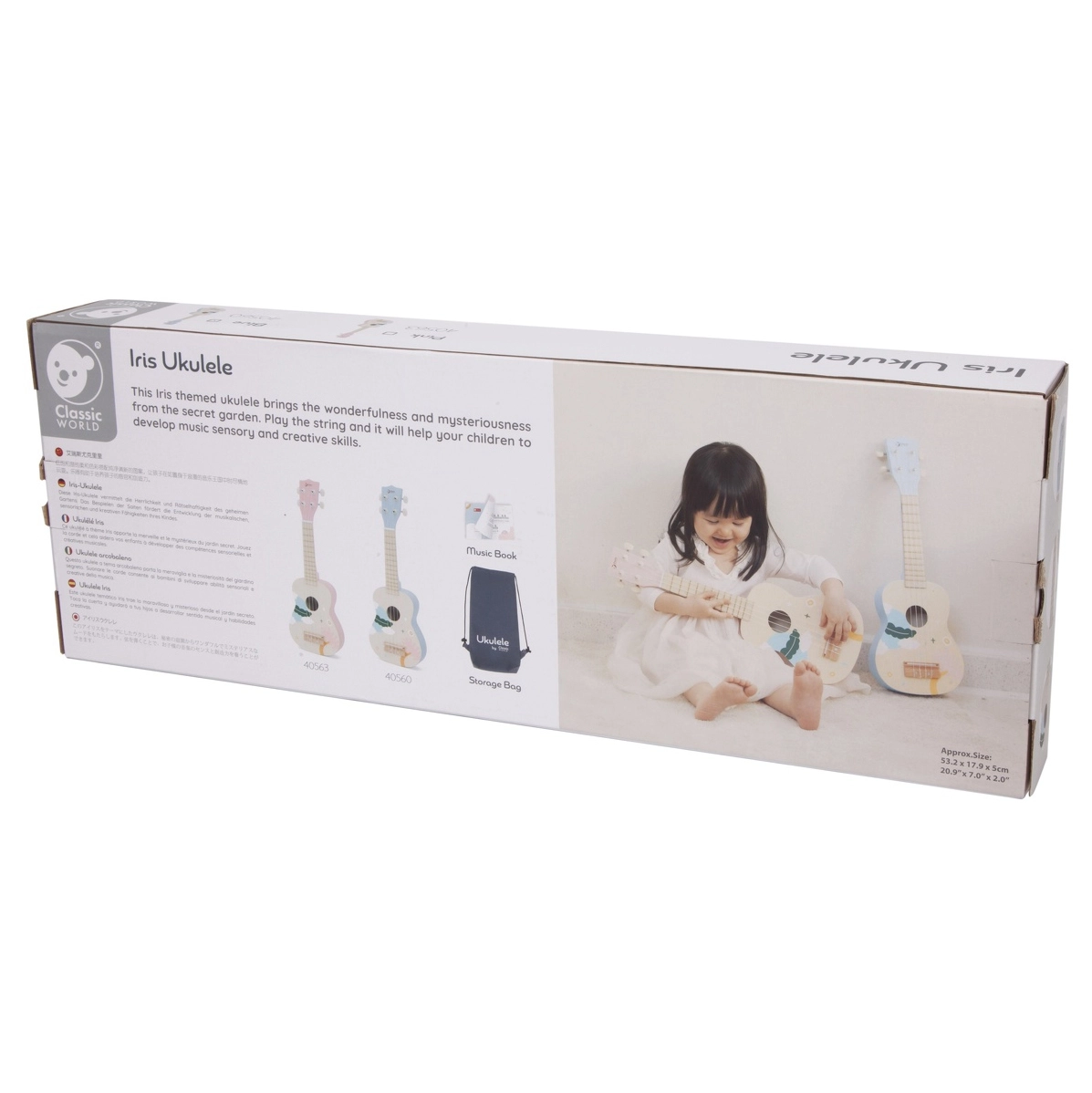 Ukulėlė pagaminta iš patvaraus medžio ir padengta netoksiškais dažais. Garsas subalansuotas ir ne per garsus, todėl švelnus vaiko klausai. Rinkinyje yra apsauginis dėklas ir sąsiuvinis su paprastomis natomis, tad jūsų vaikas gali iškart pradėti groti.