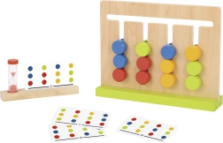 Šis edukacinis žaidimas suteikia vaikams džiaugsmo atrandant ir lavina susikaupimą. Užduotis – pagal pasirinktą kortelę perkelti spalvotus diskus į teisingą eilę ir suspėti per laiką, kurį matuoja smėlio laikrodis. Medinė konstrukcija maloni laikyti, o paviršius padengtas netoksiškais dažais.