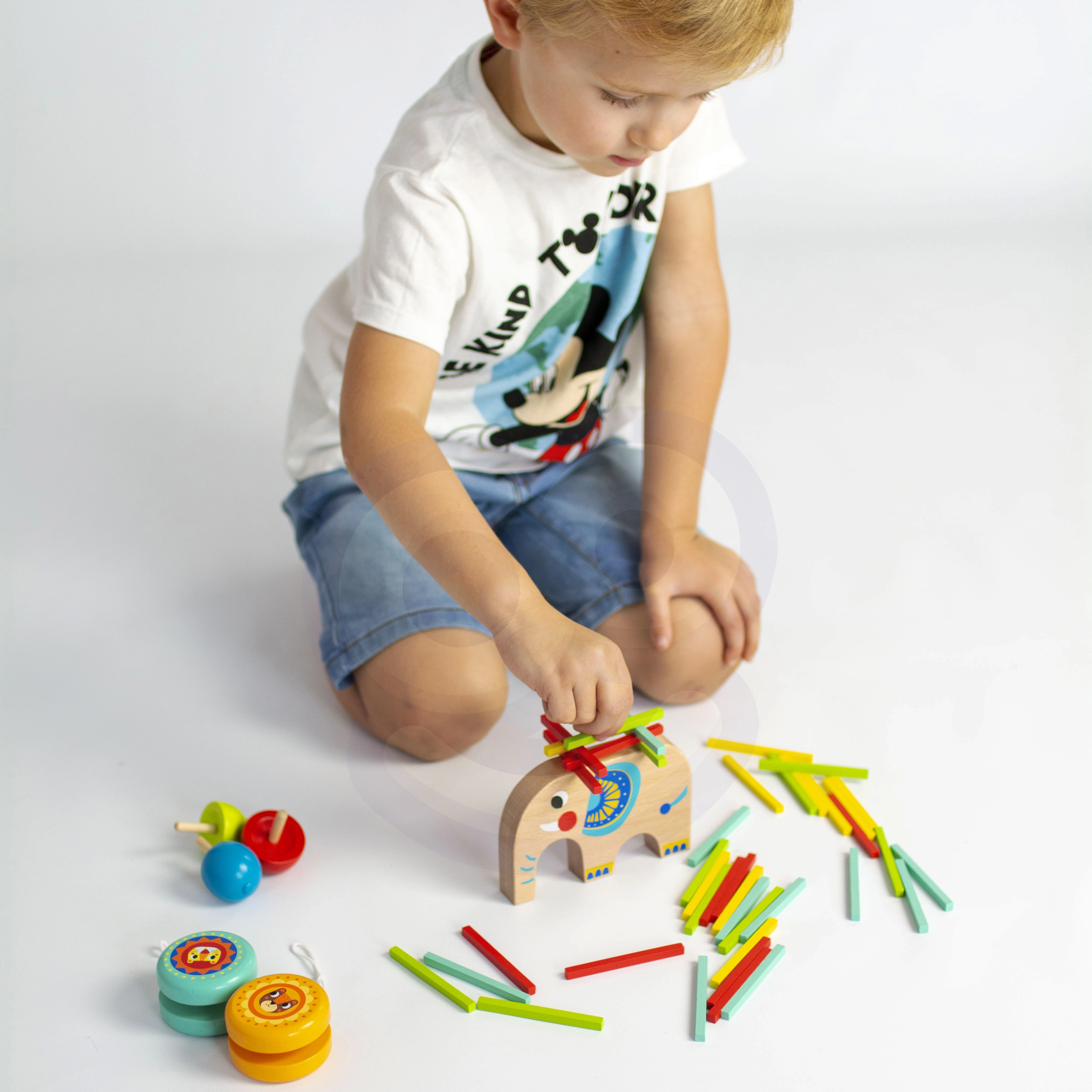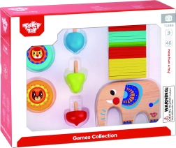 Šis spalvingas 46 dalių medinis rinkinys apjungia kelis mėgstamus žaidimus vienoje pakuotėje. Vaikai gali balansuoti lazdelėmis ant dramblio nugaros, statyti bokštą ar šulinį, žaisti mikadą, treniruoti triukus su dviem jojo ir varžytis, kurio suktukas suksis ilgiau. Idealu savarankiškam žaidimui ir šeimos varžyboms.