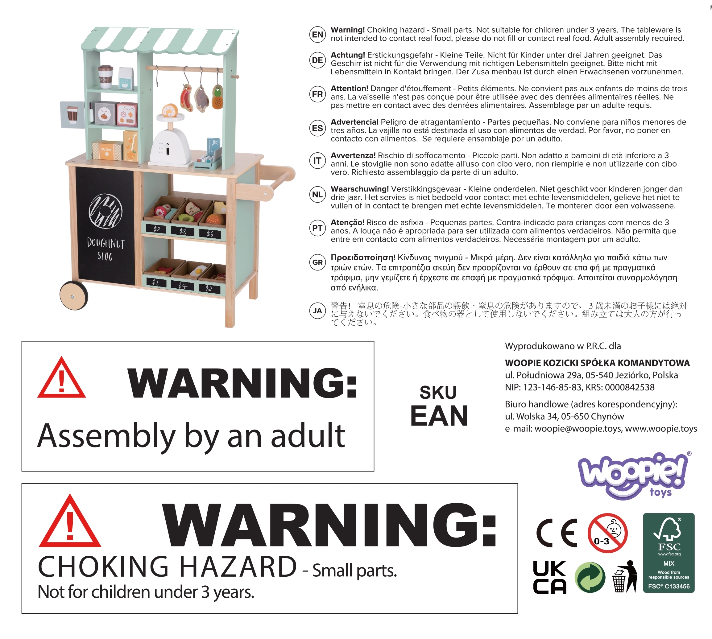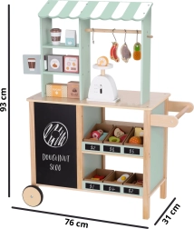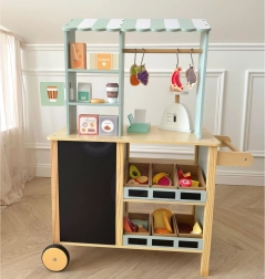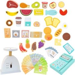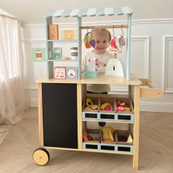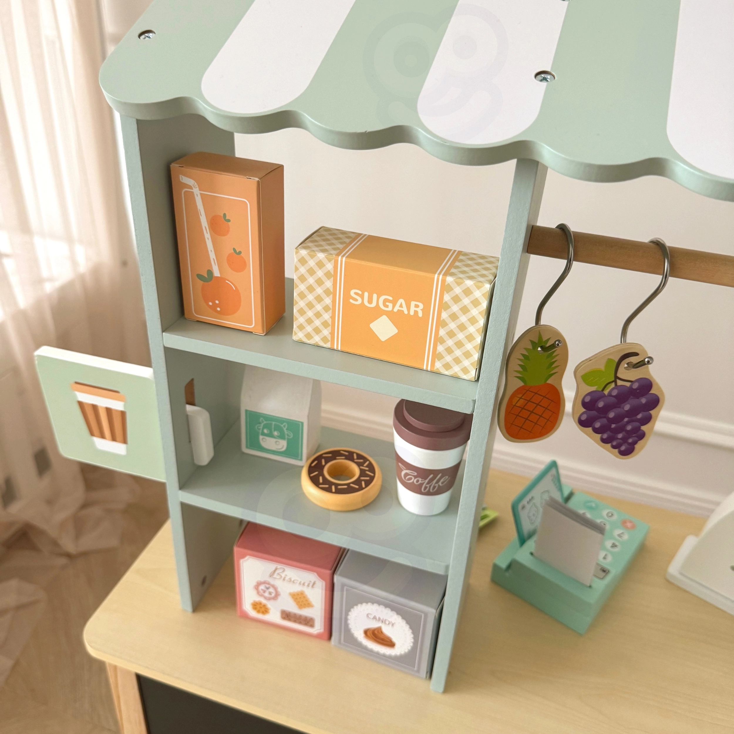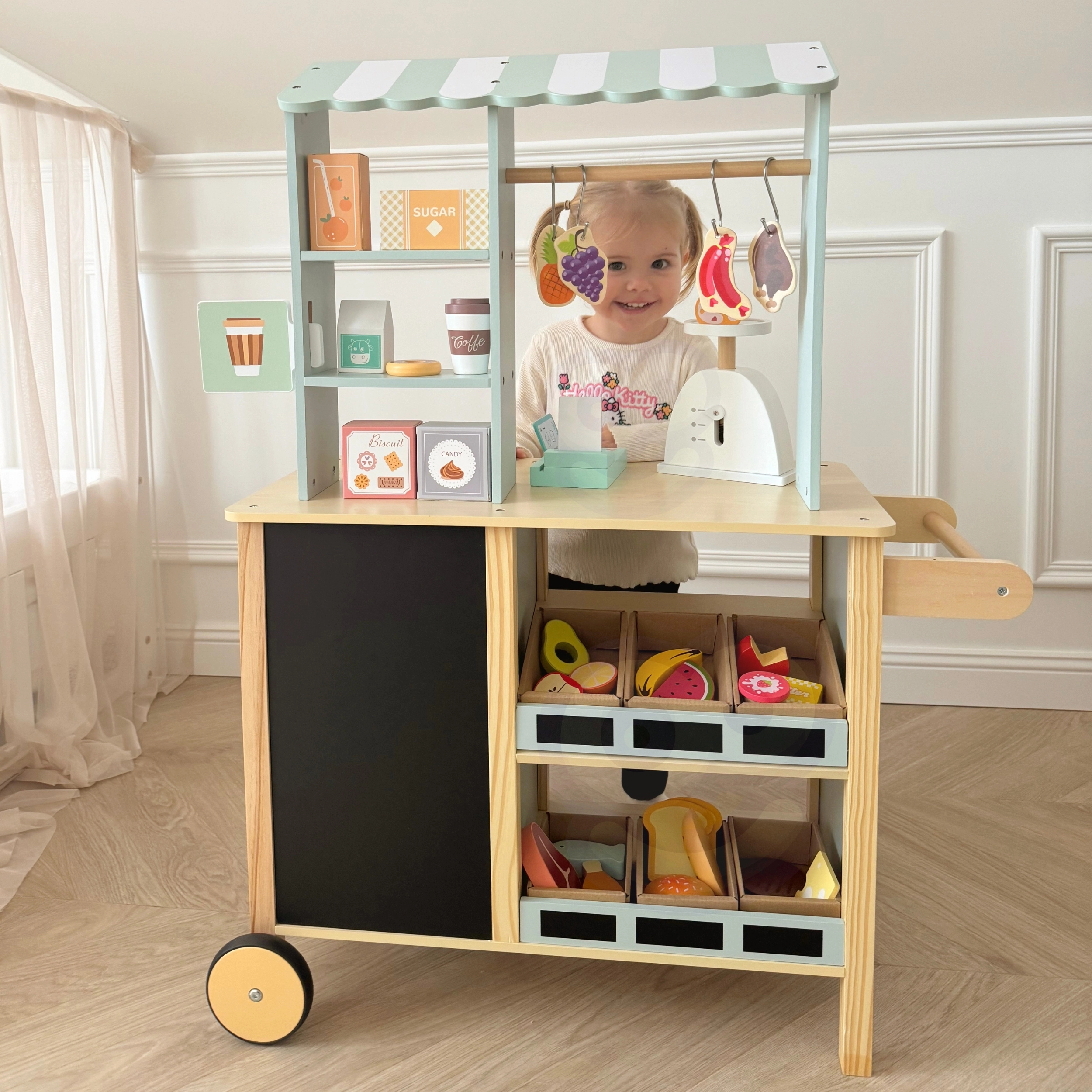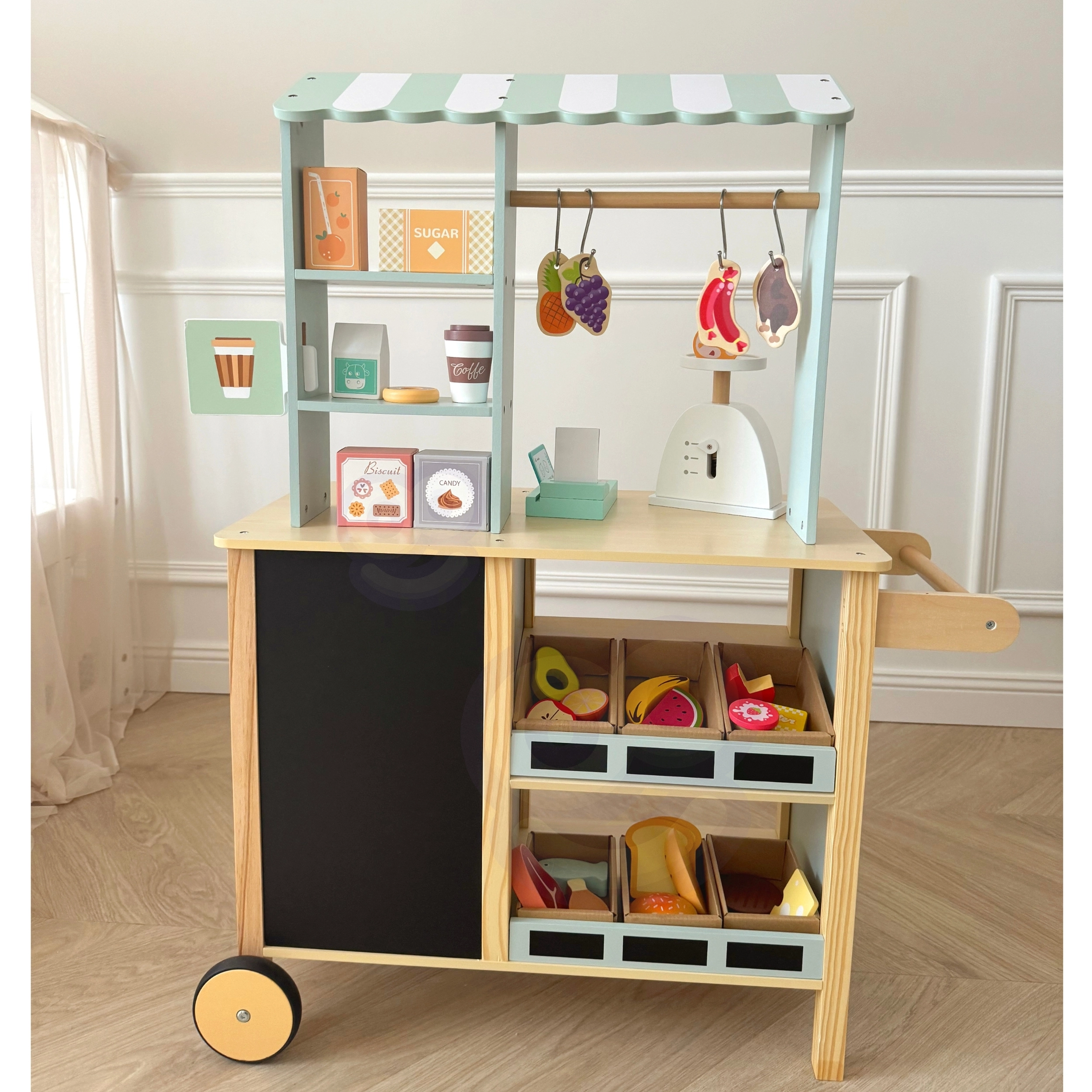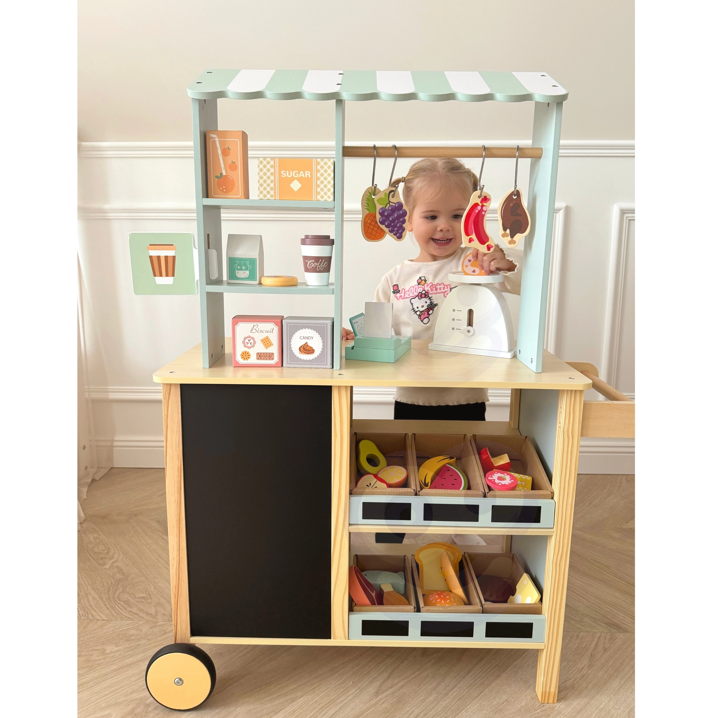 Medinė parduotuvė WOOPIE GREEN – idealiai tinka vaikams, kurie per vaidmenų žaidimus mokosi socialinių, matematinių ir organizacinių įgūdžių. Rinkinyje yra 73 elementai, įskaitant svarstykles, maisto produktus, kortelių skaitytuvą ir kreidinę lentą užrašams. Viskas pagaminta iš saulios medienos ir dažyta netoksiškais dažais.