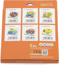 Kiekviena dėlionė turi vis kitą formą – lėktuvas, boružėlė, automobilis ir drugelis, kas lavina koordinaciją ir pažintinius gebėjimus.