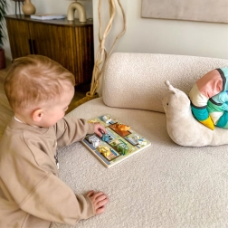 Patvari medinė lenta, glotnūs kraštai ir netoksiški dažai. Stori (chunky) detalių elementai lengvai sugriebiami, skatina smulkiąją motoriką ir akių–rankos koordinaciją.