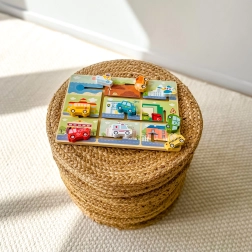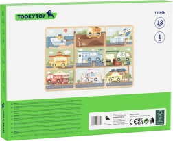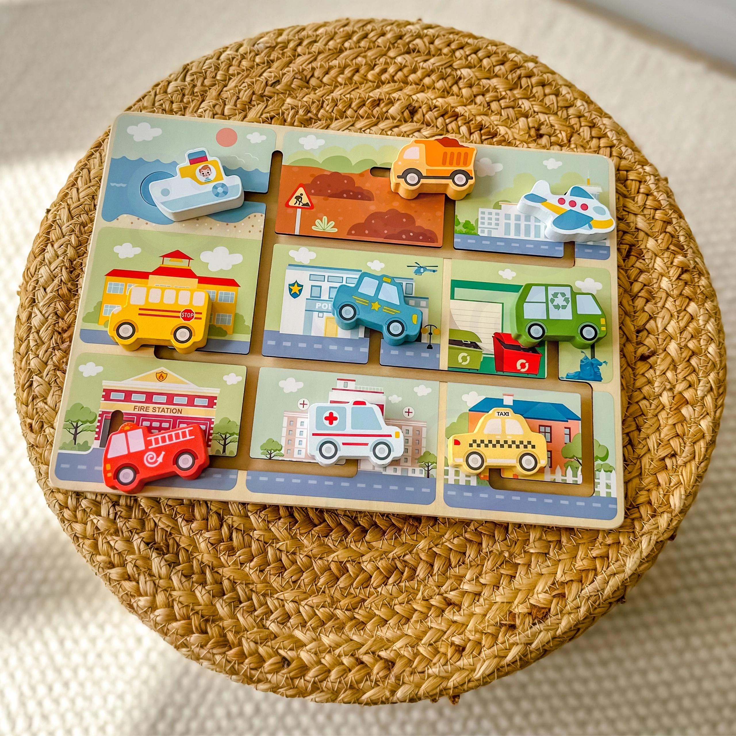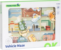 Atraskite žaismingą medinį žaislą patiems mažiausiems – TOOKY TOY transporto priemonių labirintą. Vaikai stumdo spalvingą automobilį, autobusą, greitosios pagalbos automobilį ar laivą pažymėtais takeliais ir ieško jų teisingų vietų. Skatina smulkiąją motoriką, akių–rankos koordinaciją, loginį mąstymą ir transporto priemonių bei gelbėjimo tarnybų pažinimą.