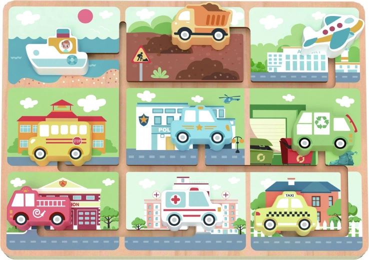 Šis kokybiškas medinis labirintas su miesto ir transporto priemonių motyvais – idealiai tinka vaikams nuo 18 mėnesių. Tvirta lenta, glotnūs kraštai ir sodrios spalvos iš saugių, netoksiškų dažų užtikrina saugų ir ilgalaikį žaidimą. Vaikai stumdo atskiras detales išfrezuotais takeliais ir mokosi, kur priklauso policijos automobilis, greitoji pagalba, mokyklinis autobusas, gaisrinė, laivas ar lėktuvas.