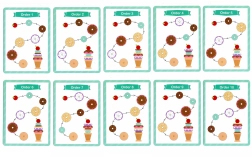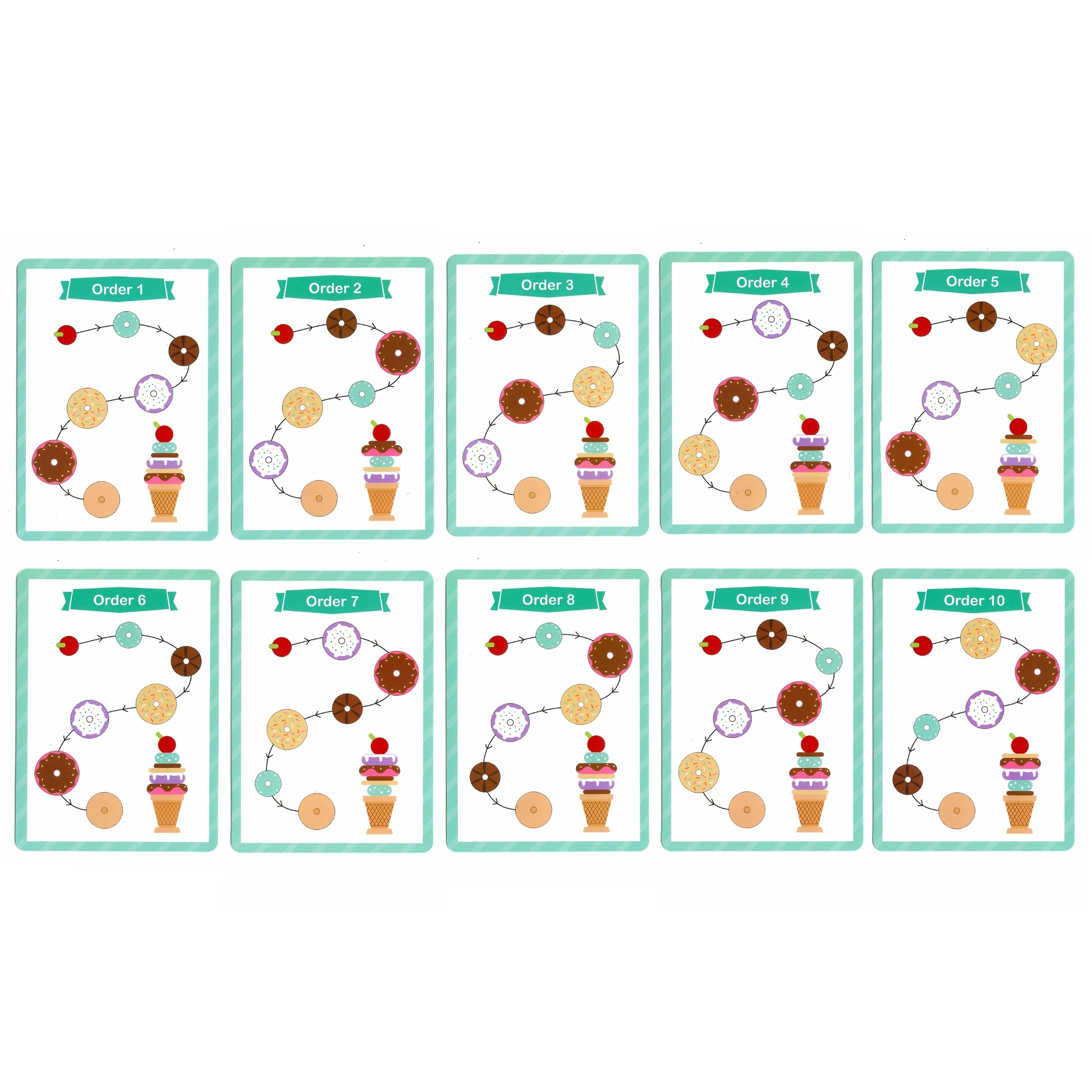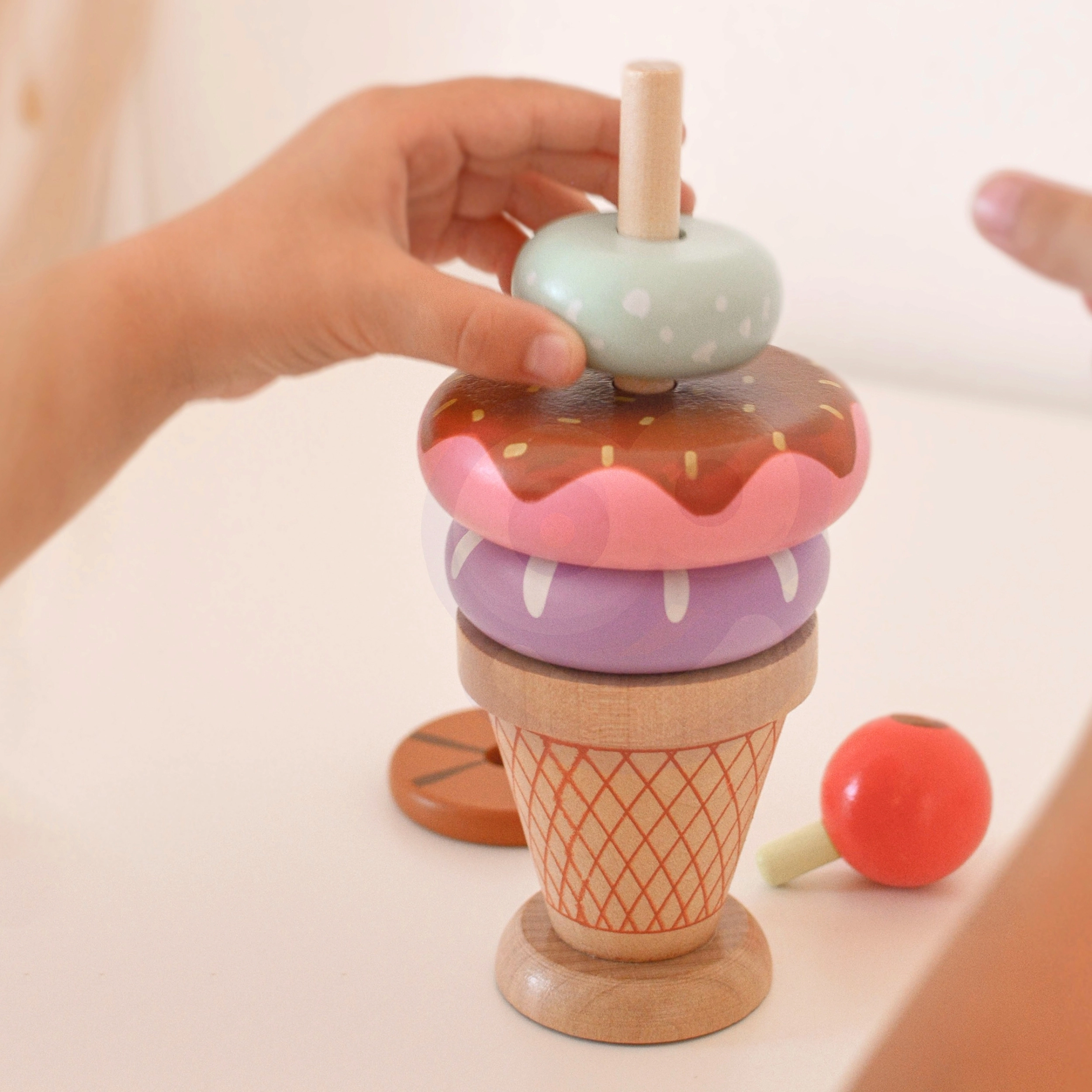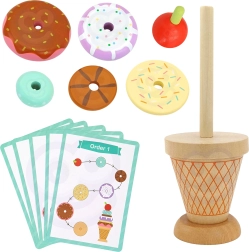 - 12 dalių rinkinyje: įvairūs spalvoti žiedai ir medinis kūgis su vyšnele viršuje
