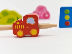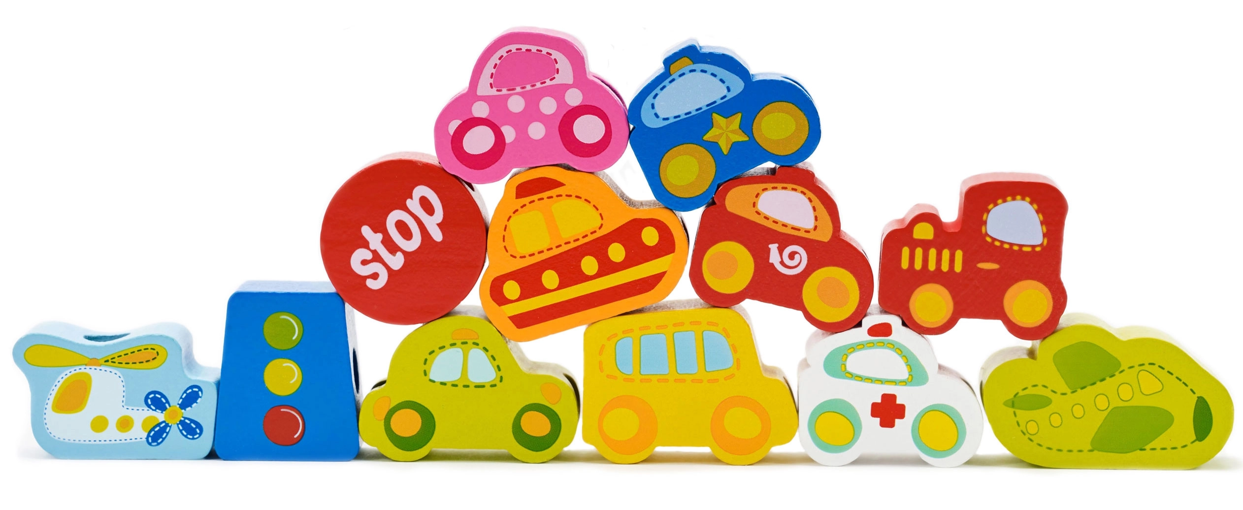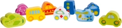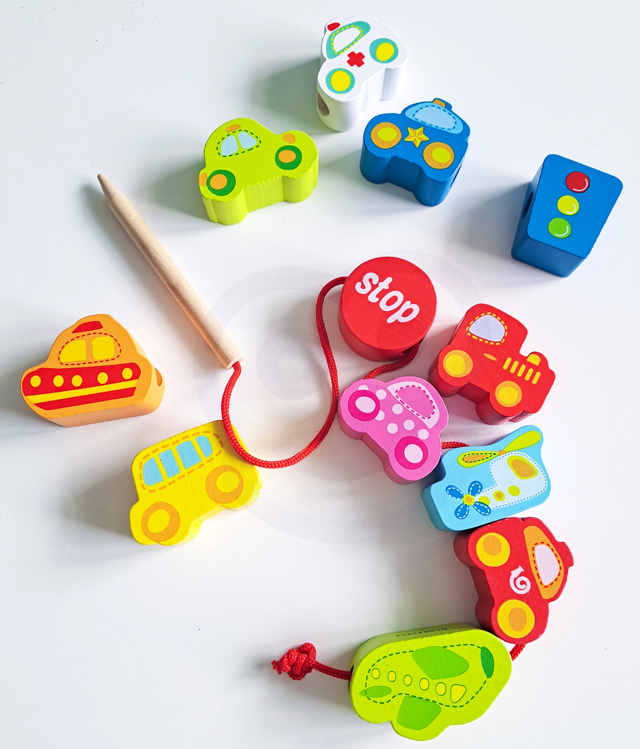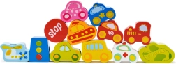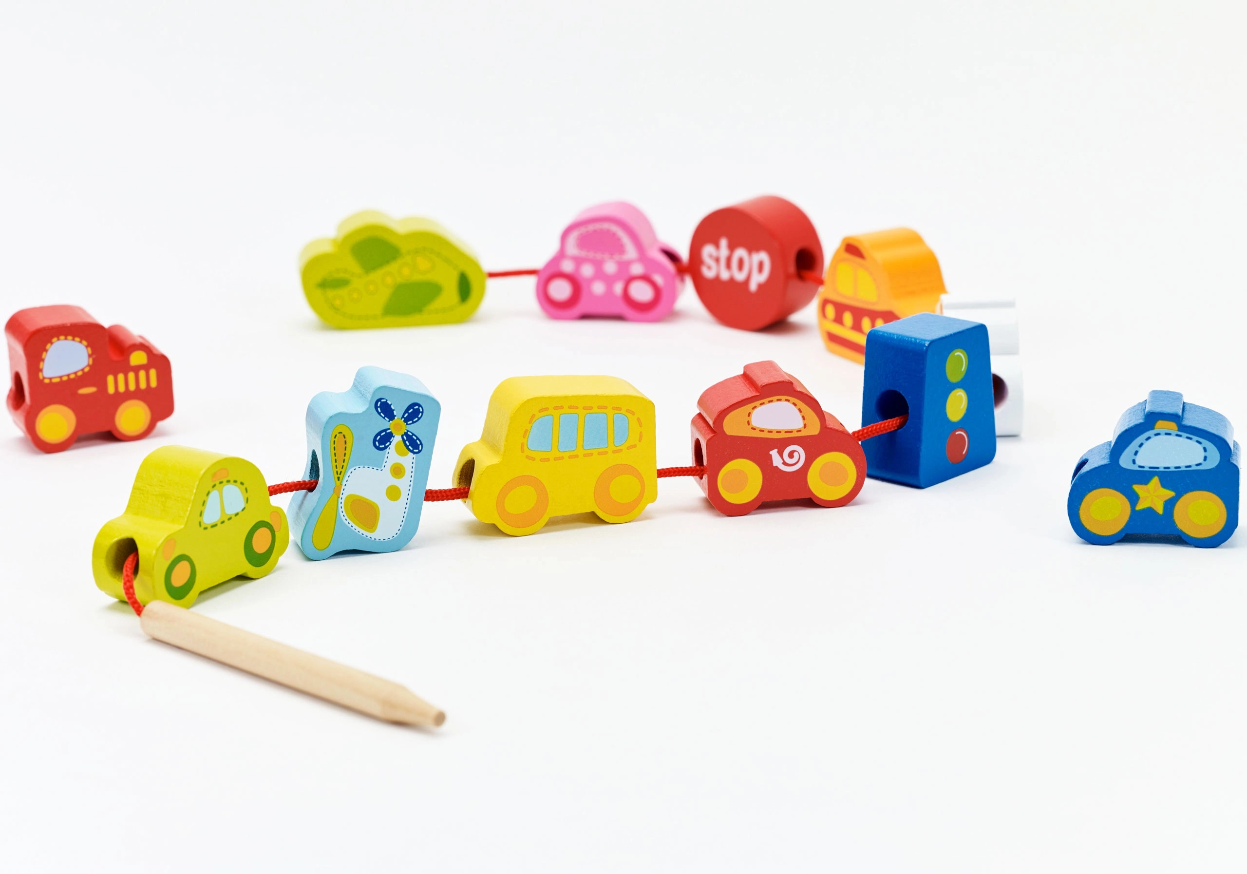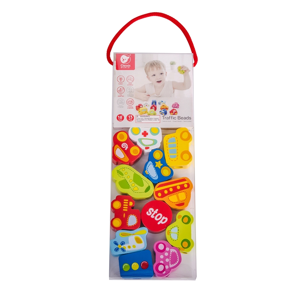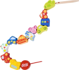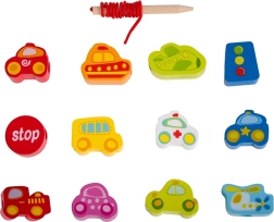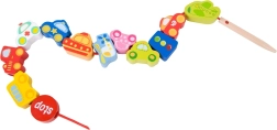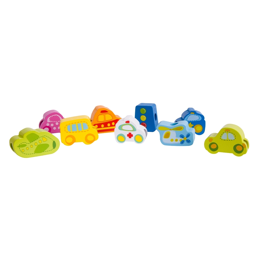 Atraskite išmanų žaislą, jungiantį mokymąsi ir pramogą. Mediniai karoliukai automobilių, autobuso, lėktuvo ir kelio ženklų formų lengvai veriami ant virvelės su mediniu galiuku. Žaisdami vaikai lavina smulkiąją motoriką, judesių tikslumą ir spalvų bei formų atpažinimą.