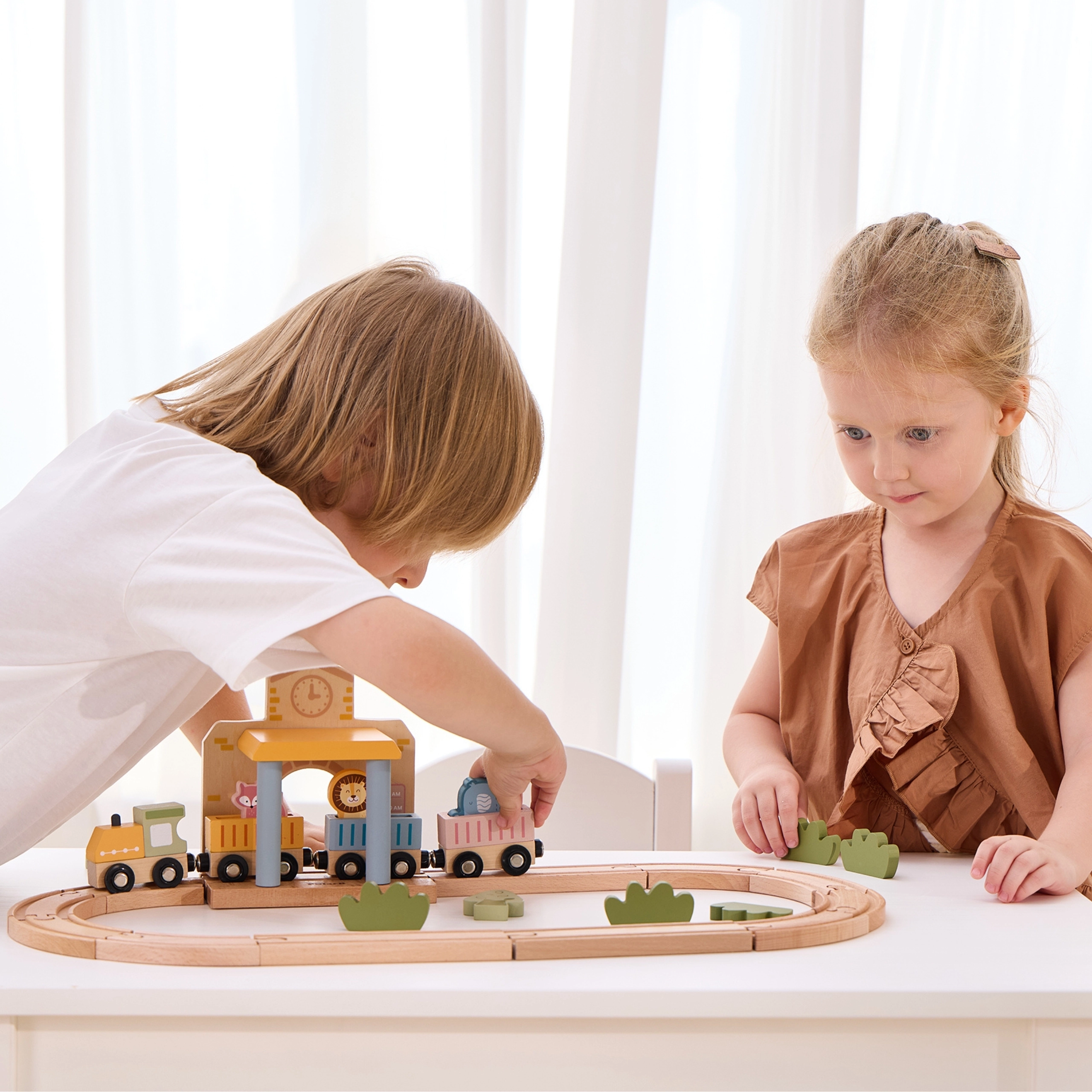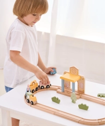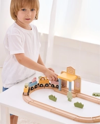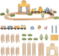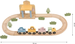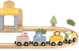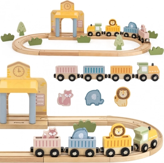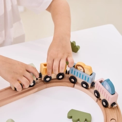 Dėl tvirto, iš kokybiško medžio pagaminto atlikimo rinkinys yra patvarus ir saugus kasdieniam žaidimui. Vaikai lavina smulkiąją motoriką, akių–rankų koordinaciją ir kūrybiškumą kurdami istorijas su gyvūnėliais – drambliu, liūtu ir lape. Traukinio rinkinys puikiai tinka tiek savarankiškam, tiek bendram žaidimui.