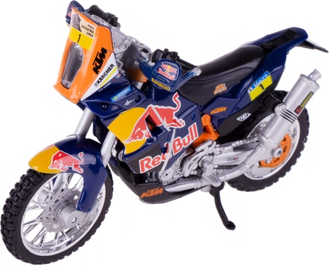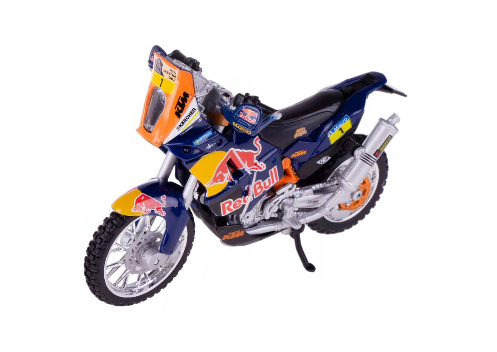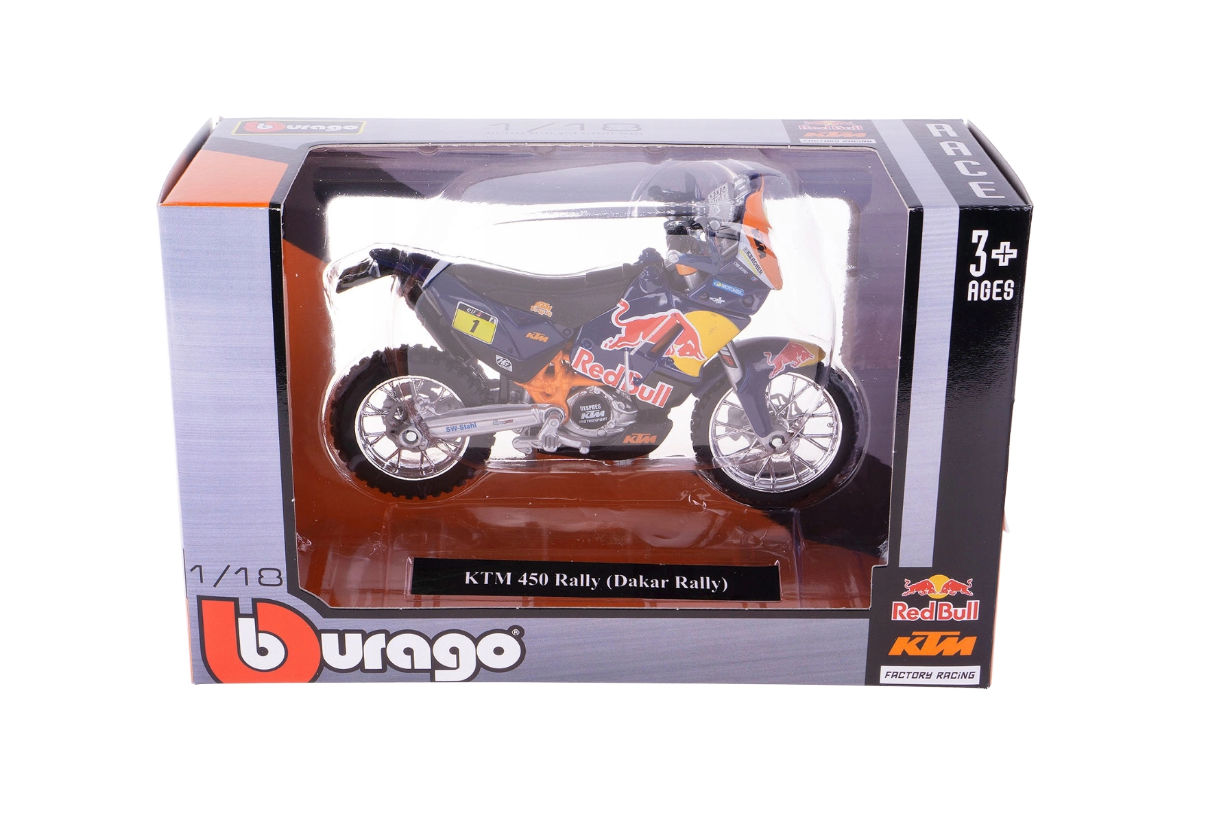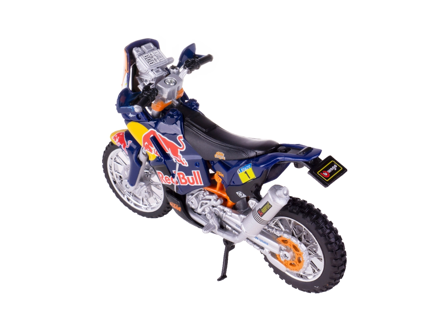 Detalus motociklo modelis Red Bull KTM 450 Rally masteliu 1:18 iš prekės ženklo Bburago. Metalinė konstrukcija su plastikiniais priedais siūlo realistiškas detales ir yra ideali kolekcionieriams bei mažiesiems lenktynininkams nuo 3 metų.