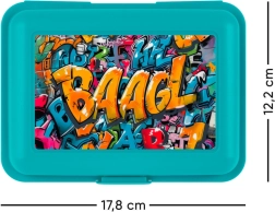 Pietų dėžutė su ryškiu graffiti motyvu ir BAAGL logotipu, suteikiančiu išskirtinį stilių.