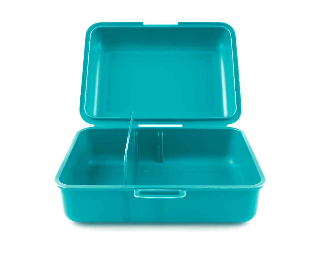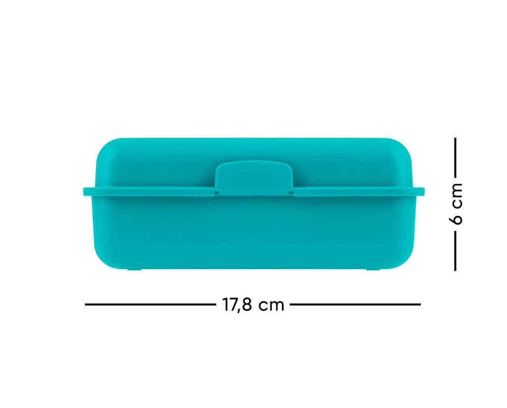Turkio spalvos plastikinė dėžutė, kurios matmenys 17,8 cm x 12,2 cm, tinkama maisto nešiojimui.