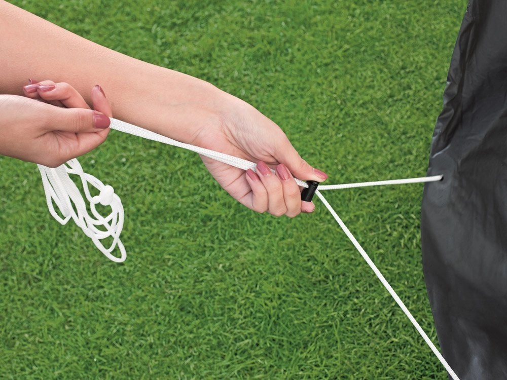 Lengvas pritvirtinimas su pridedamomis virvutėmis užtikrina tvirtą ir saugų baseino uždengimą.
