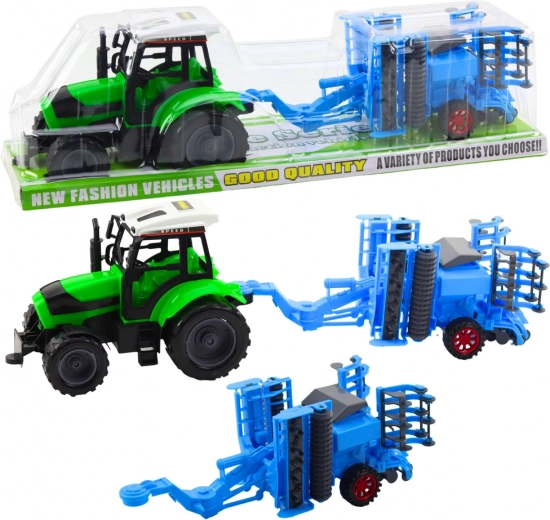 Komplekte yra traktorius, lėkštinė akėčių sija ir originali pakuotė – ideali dovana mažiesiems ūkininkams.