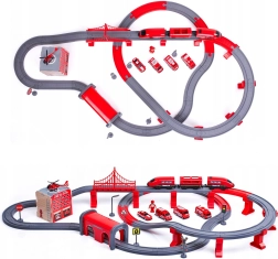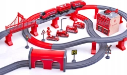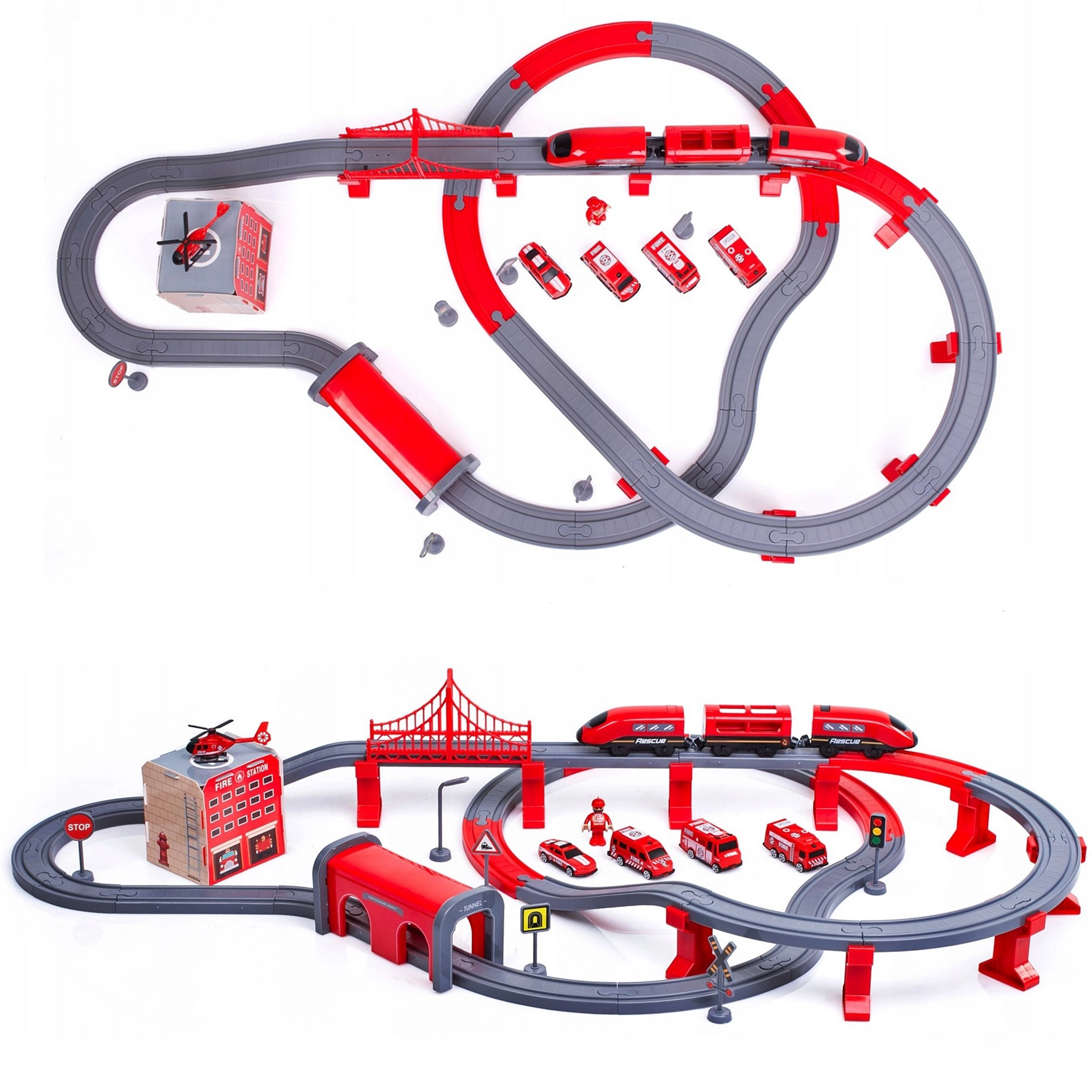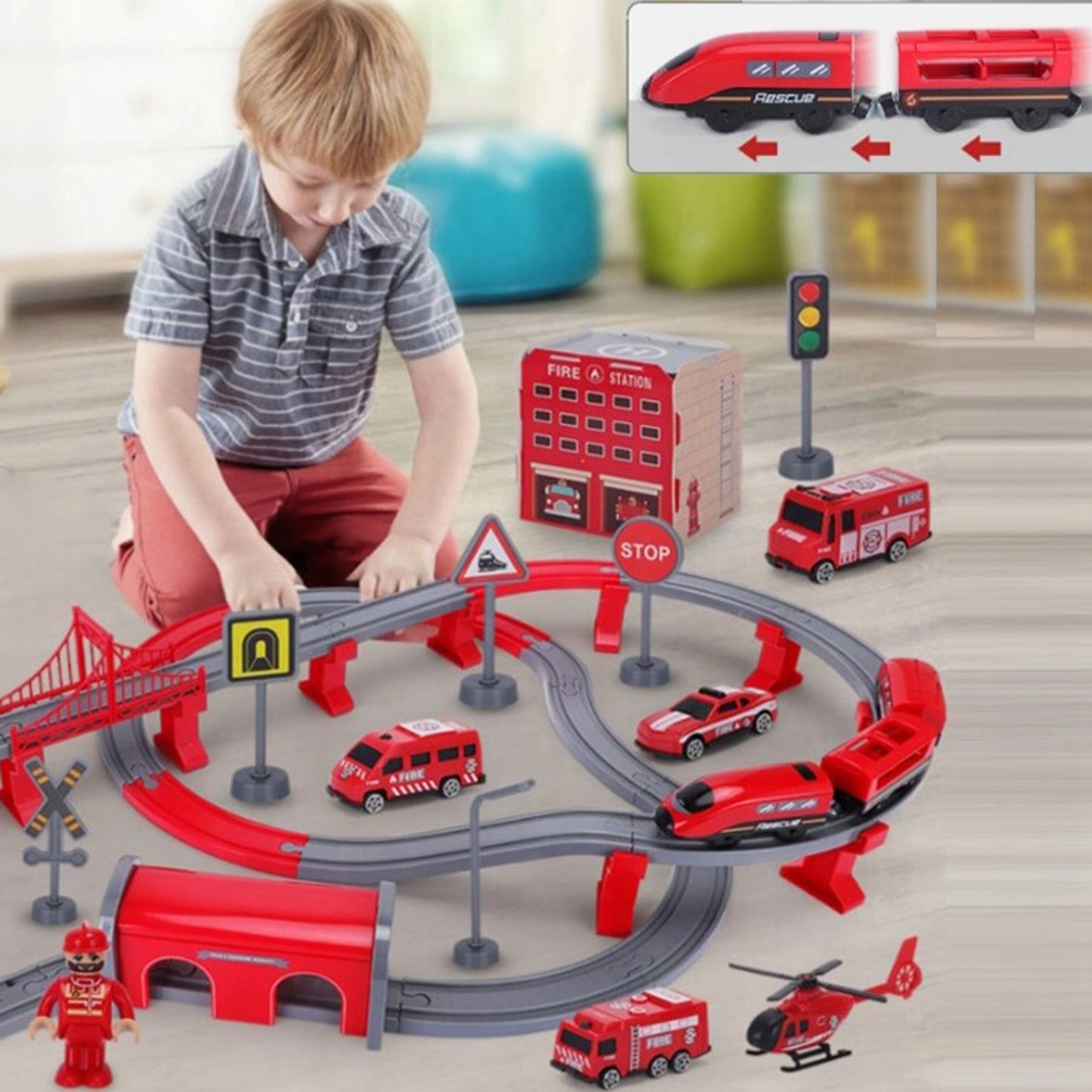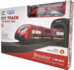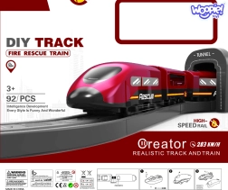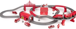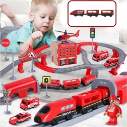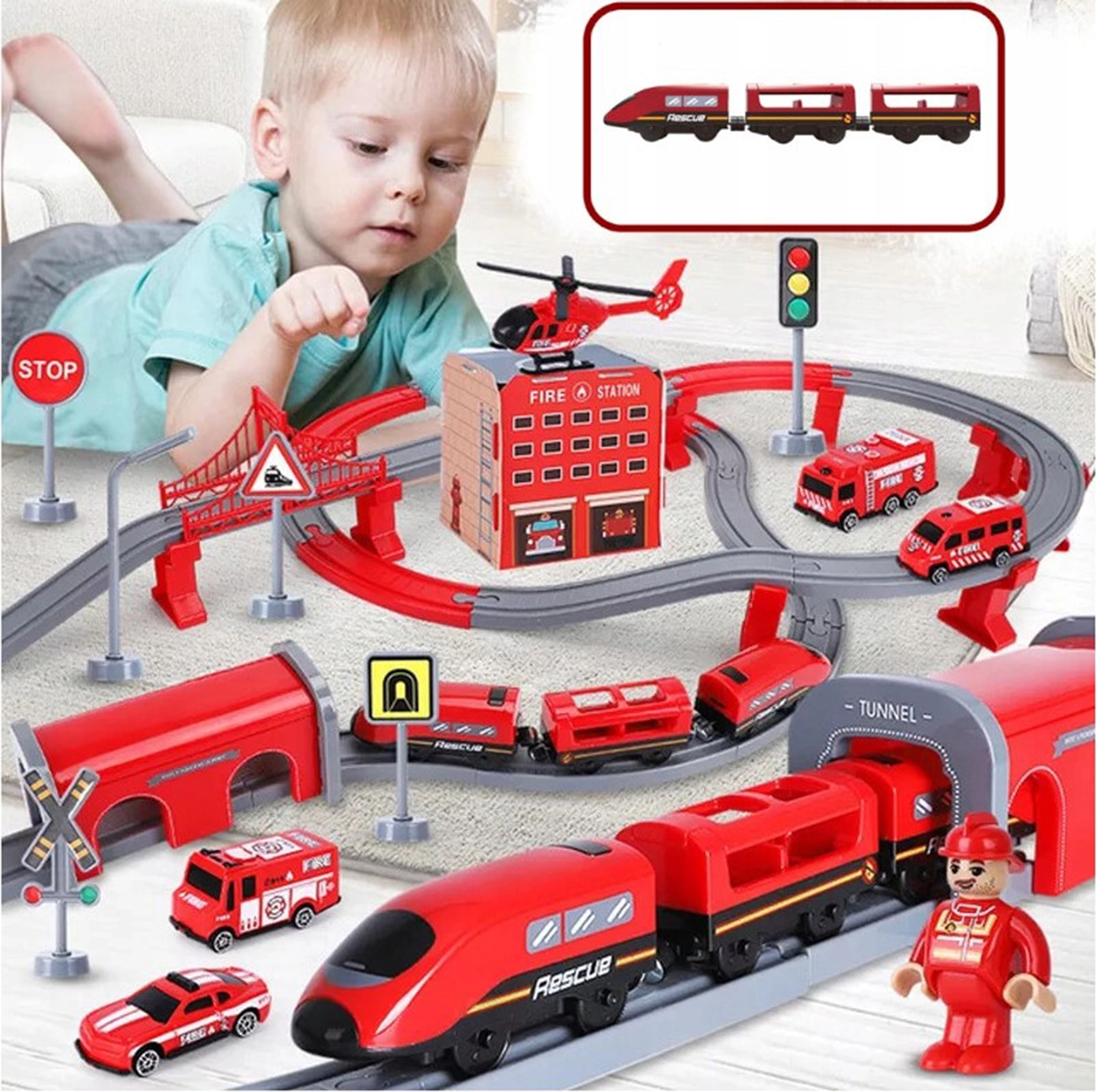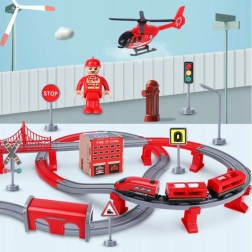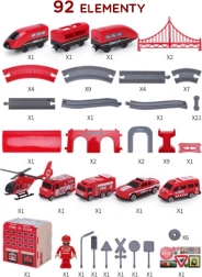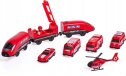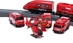 Į komplektą įeina lokomotyvas (2× AAA, nepridedama), 2 vagonai, 4 gaisrinės transporto priemonės, sraigtasparnis, gaisrininko figūrėlė, depas, tiltas, tunelis, bėgiai, atramos ir kelio ženklai. Geležinkelio ir kelių gelbėjimo technikos derinys skatina rankų–akių koordinaciją, erdvinę orientaciją ir siužetinį žaidimą.
