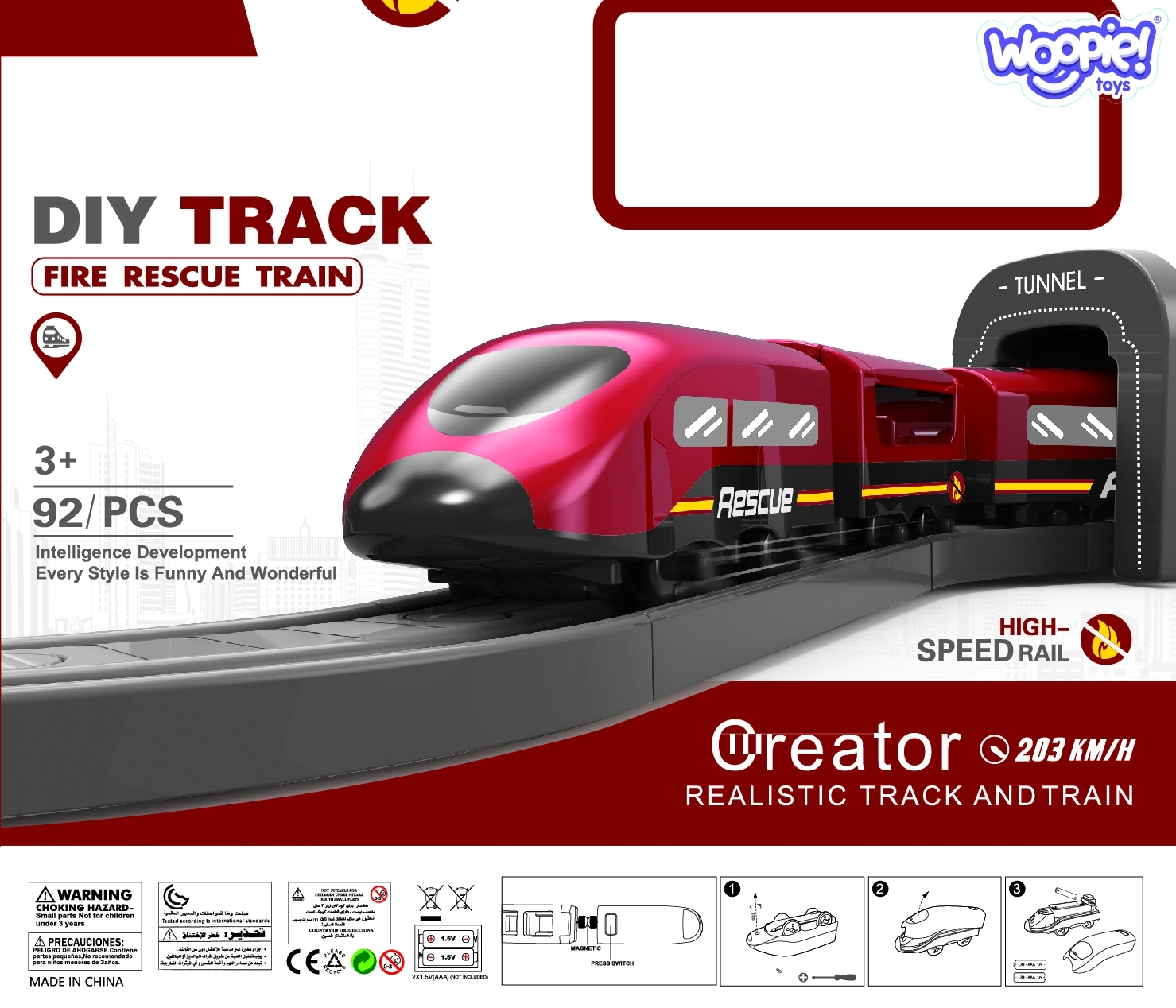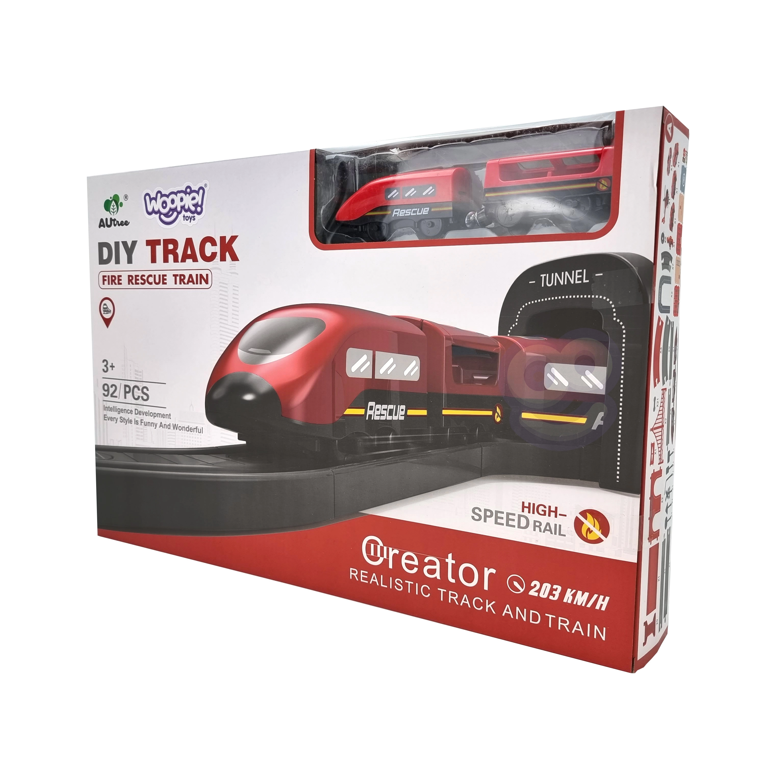 WOOPIE elektrinė gaisrininkų trasa suteikia vaikams įtraukiančių gelbėjimo nuotykių. Dėl baterijomis varomo lokomotyvo ir daugybės detalių priedų sukursite realistišką miestą su depu, tiltu ir tuneliu. Rinkinys idealiai tinka kaip dovana ir siūlo valandas kūrybiško žaidimo vaikams nuo 3 metų.