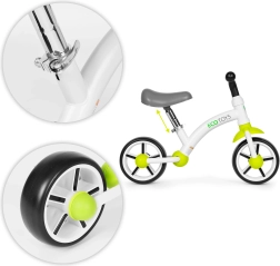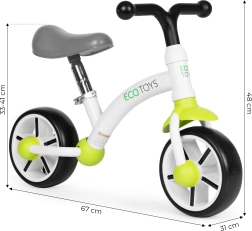 ECOTOYS balansinis dviratukas – idealus pirmasis „dviratis“ mažiesiems. Važiuojant be pedalų vaikas natūraliai mokosi išlaikyti pusiausvyrą ir teisingai valdyti kryptį, kas paspartina perėjimą prie įprasto dviračio. Lengva ir patvari konstrukcija užtikrina paprastą naudojimą ir ilgą tarnavimo laiką.