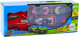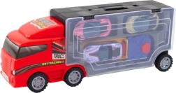 Smagus rinkinys mažiesiems lenktynininkams: raudonas sunkvežimis su permatoma saugojimo erdve, patogiomis pertvaromis ir paleidikliu, papildytas trimis spalvingais automobiliukais. Mobilus garažas padeda tvarkingai laikyti žaislus vienoje vietoje, paleidiklis užtikrina greitą startą lenktynėms, o patvarus plastikas žada ilgą tarnavimo laiką. Idealu namuose ir kelionėse.