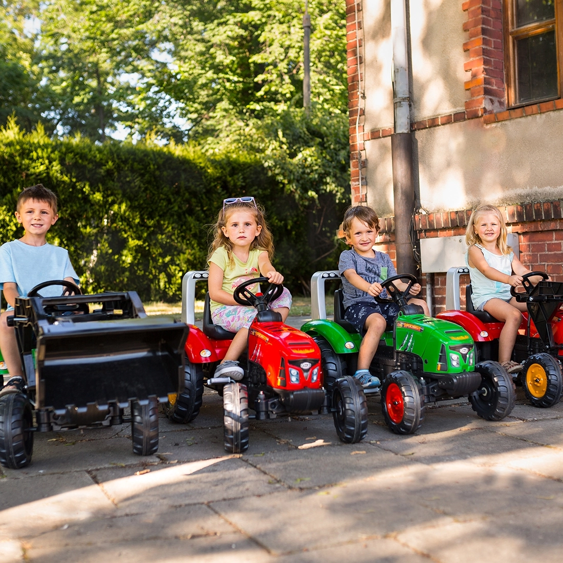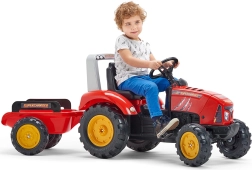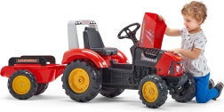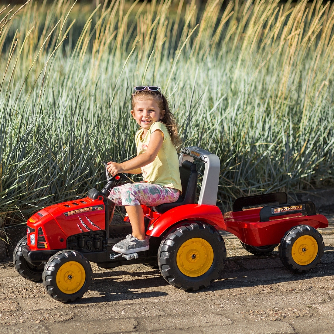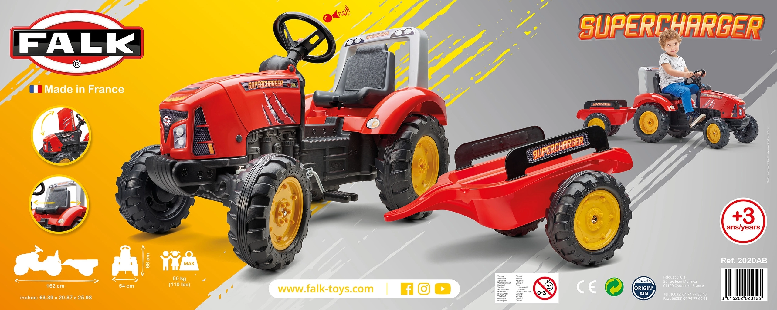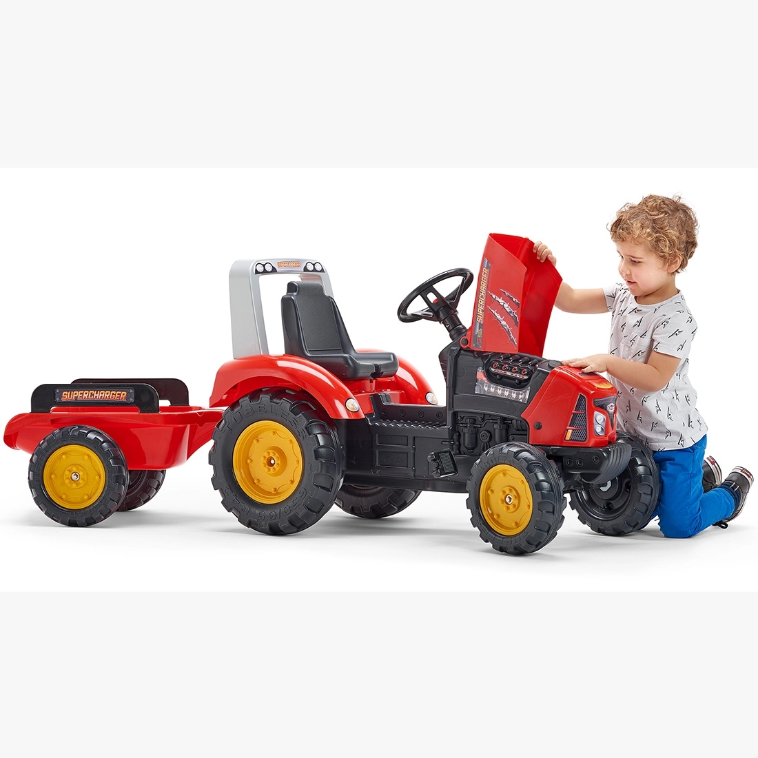 Vaikiškas minamas traktorius su priekaba Red Supercharger iš FALK pradžiugins kiekvieną mažąjį ūkininką. Jis siūlo tvirtą plastikinę konstrukciją, atidaromą variklio imitacijos dangtį, garsinį signalą ant vairo ir nuimamą priekabą. Dėl grandininės pavaros galinei ašiai ir vairuojamos priekinės ašies važiavimas yra stabilus, saugus ir smagus.