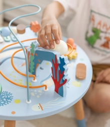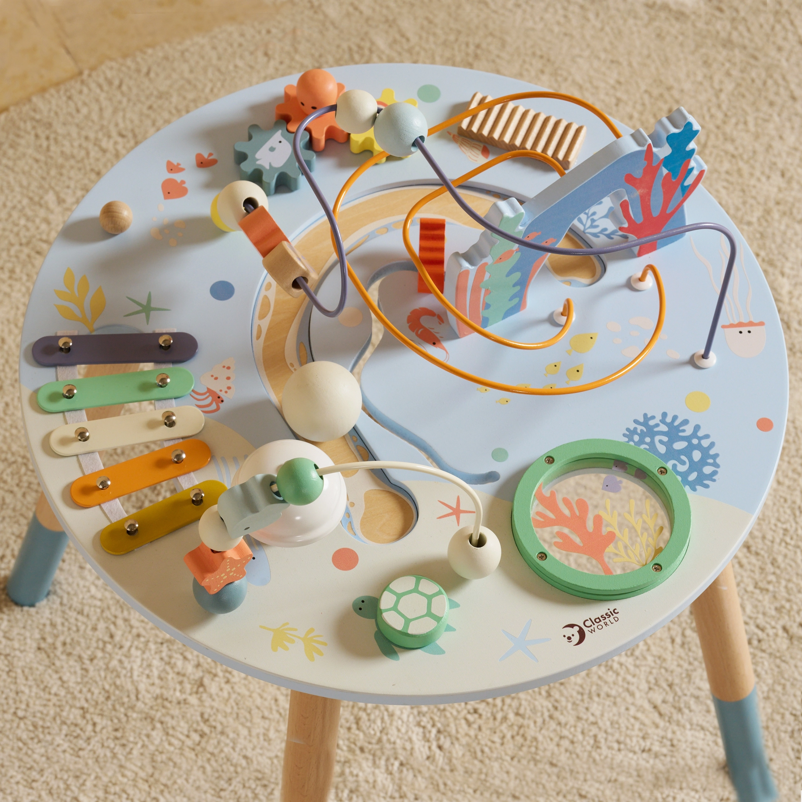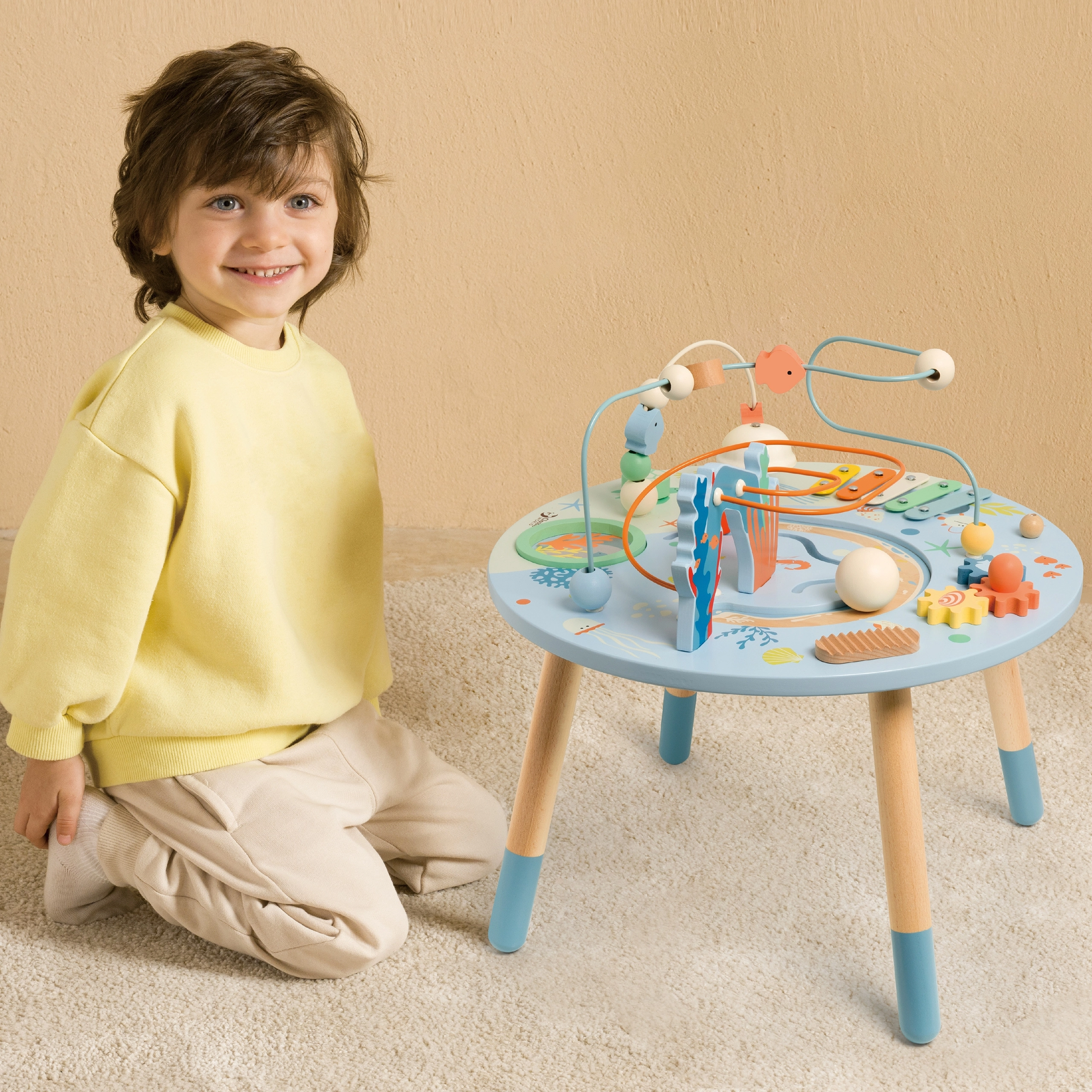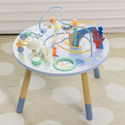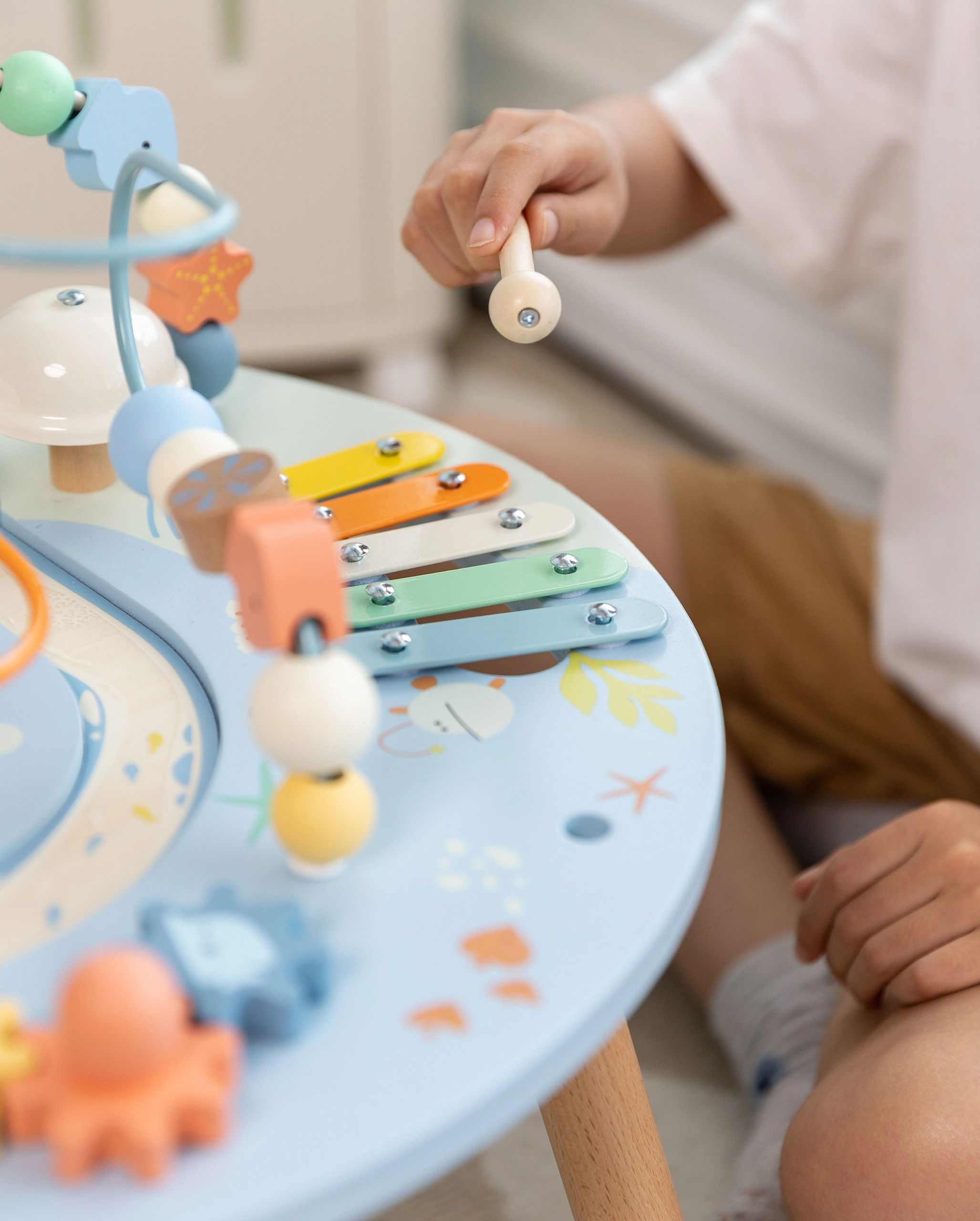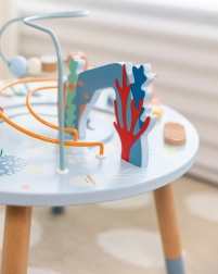Medinis veiklos staliukas Jūros pasaulis – puiki įžanga į formų ir spalvų pasaulį. Saugus patiems mažiausiems, pagamintas iš kokybiškos medienos ir dažytas nekenksmingais dažais. Vaikai skatinami žaisti stovint, o tai lavina jų koordinaciją ir pusiausvyrą. Edukacinė nauda šio staliuko – itin didelė: nuo smulkiosios motorikos gerinimo iki muzikinių įgūdžių plėtojimo.