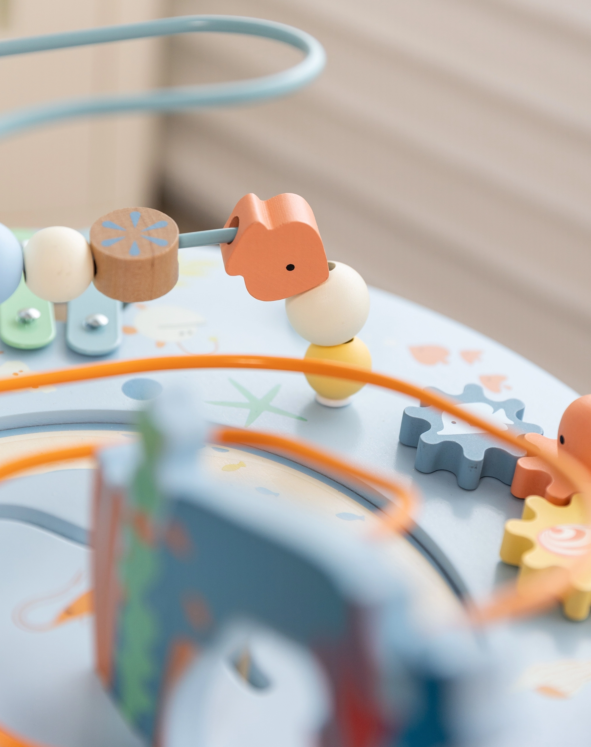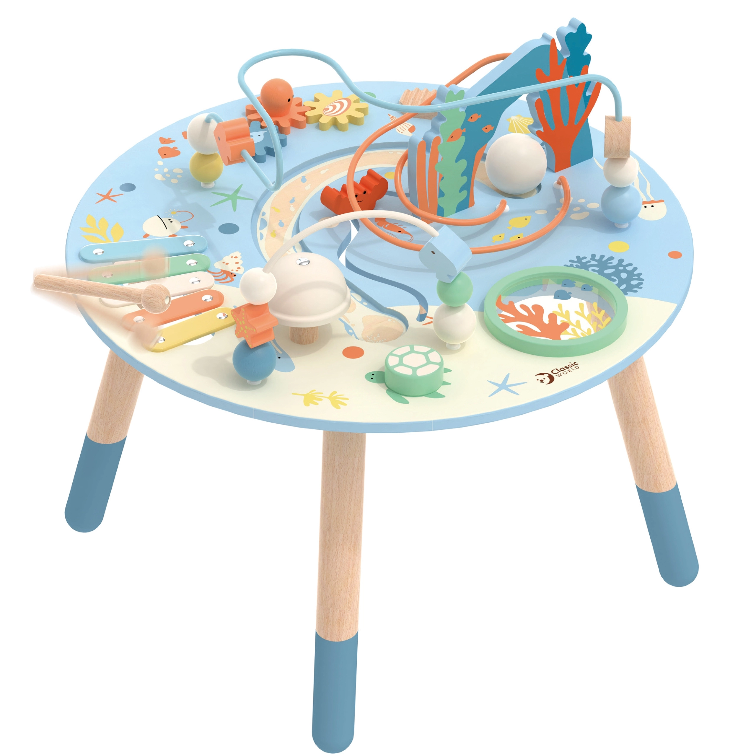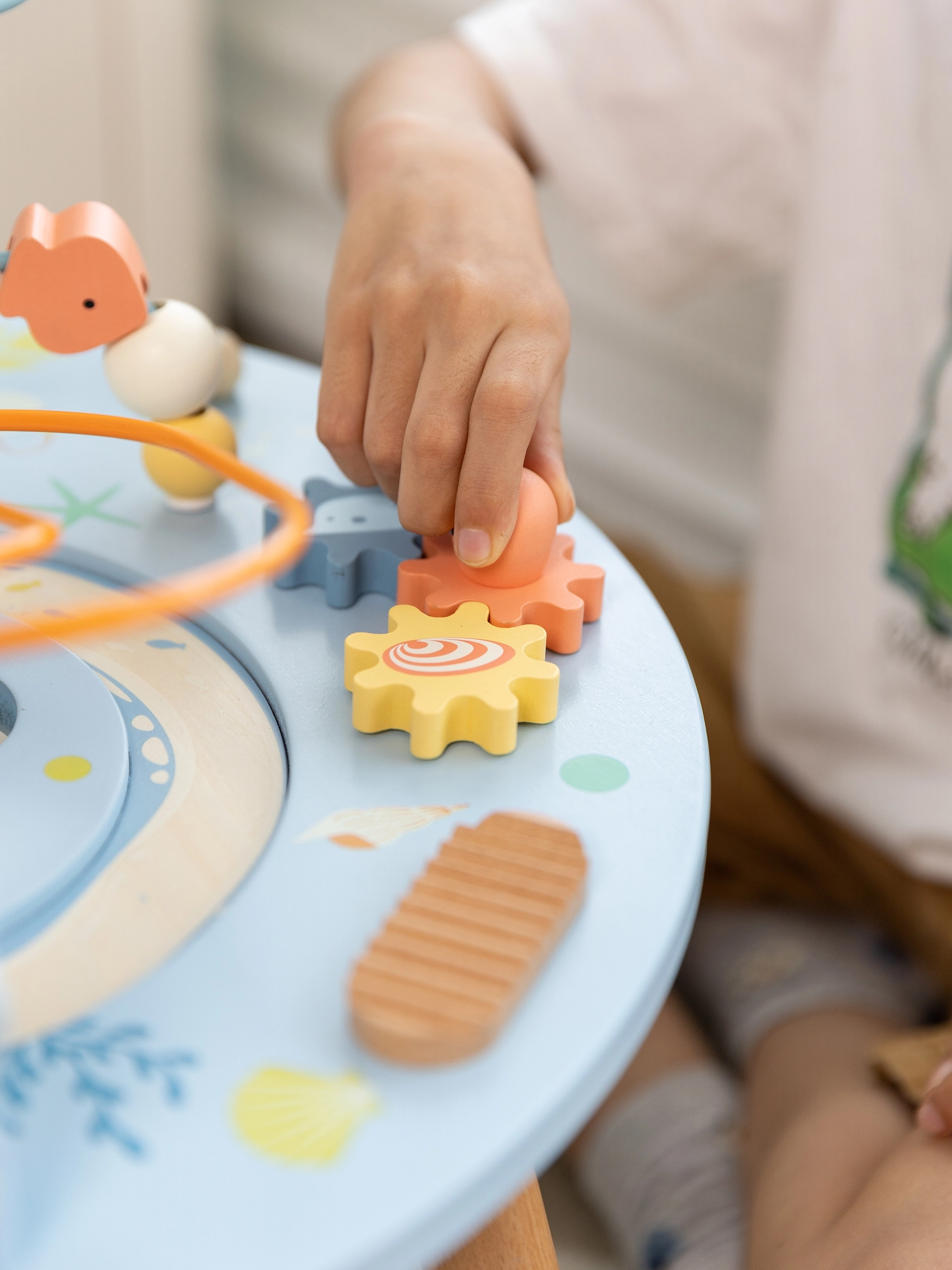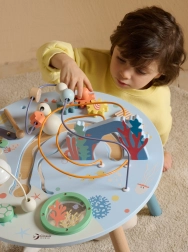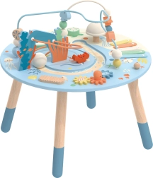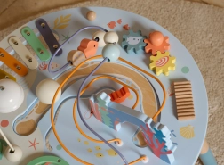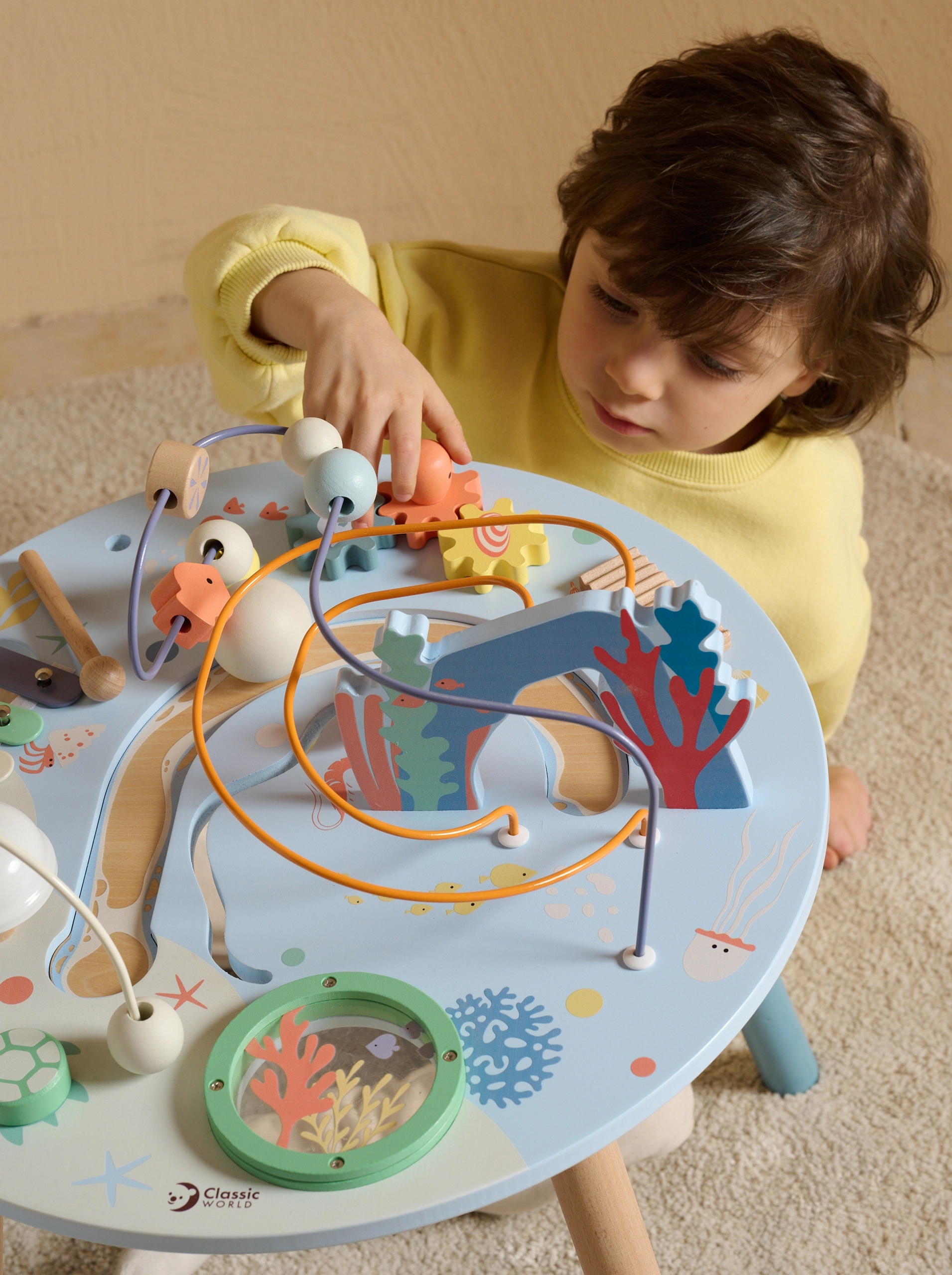 Medinis veiklos staliukas Jūros pasaulis – puiki įžanga į formų ir spalvų pasaulį. Saugus patiems mažiausiems, pagamintas iš kokybiškos medienos ir dažytas nekenksmingais dažais. Vaikai skatinami žaisti stovint, o tai lavina jų koordinaciją ir pusiausvyrą. Edukacinė nauda šio staliuko – itin didelė: nuo smulkiosios motorikos gerinimo iki muzikinių įgūdžių plėtojimo.