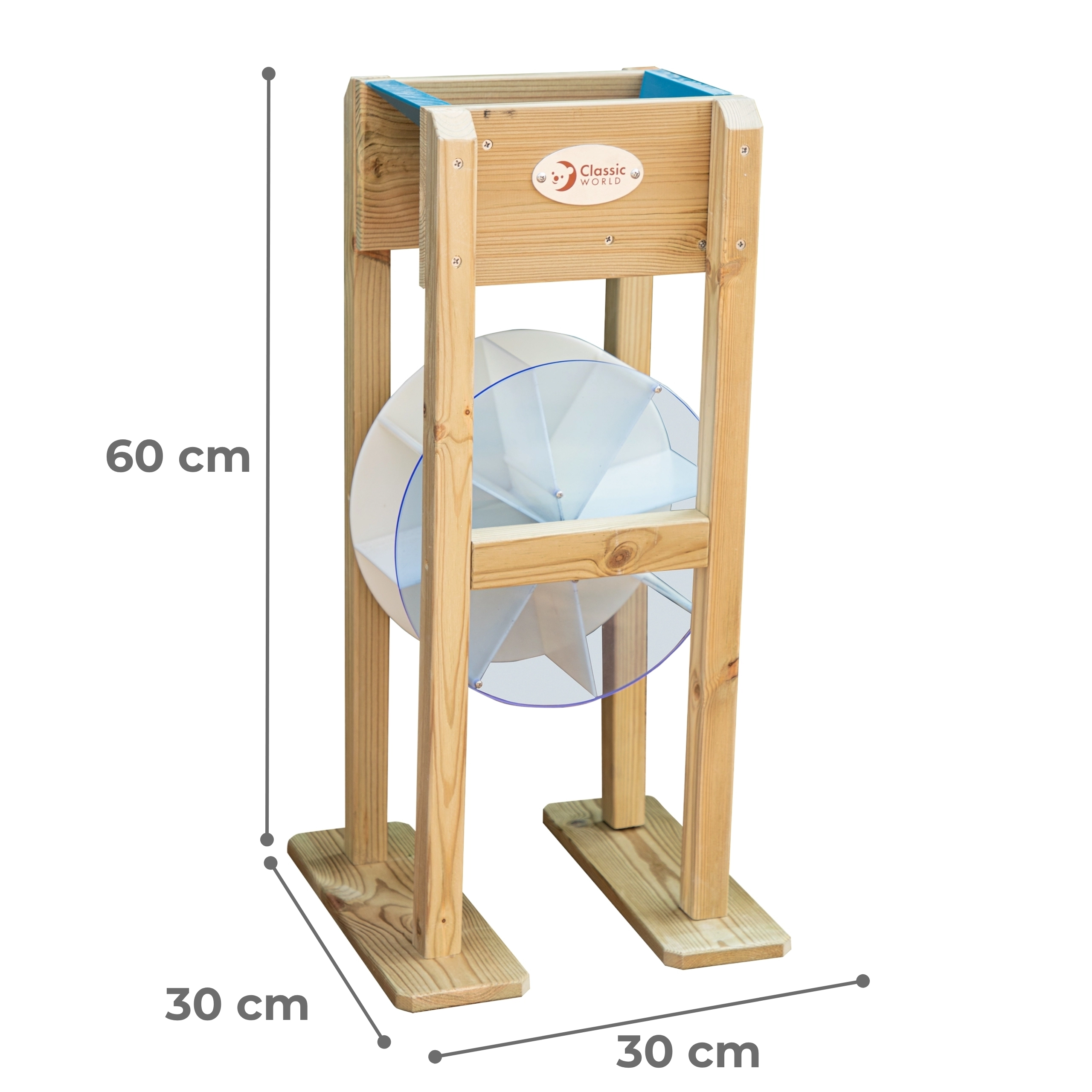Medinis malūnėlis CLASSIC WORLD EDU – puikus bet kurios smėlio dėžės ar sodo vandens žaidimų kampelio praplėtimas. Vaikai lengvai perpras srovės ir rato sukimosi principus – tereikia paberti smėlio arba pripilti vandens ir stebėti, kaip mėlynas ratas ima suktis. Dėl tvirtų medinių šoninių sienelių ir stabilaus pagrindo malūnėlis pasiruošęs kasdieniams vaikų eksperimentams.