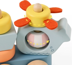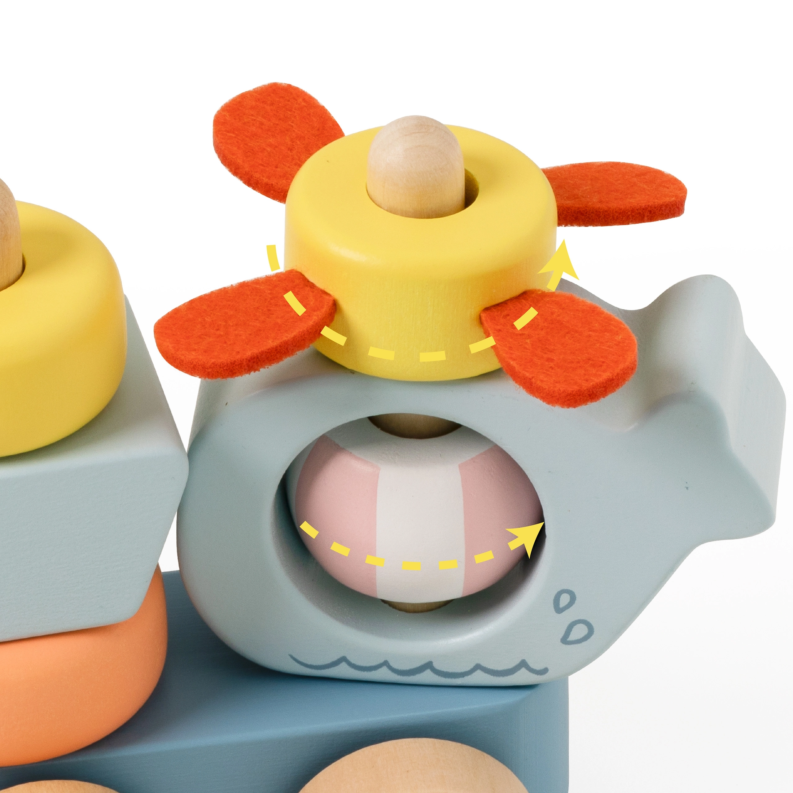 Rinkinyje yra įvairių vandenyno motyvų formų (laivai, švyturys, sraigtasparnis, jūros gyvūnai). Vaikai rūšiuoja, stato ir derina, taip ugdydami logiką ir kūrybiškumą.