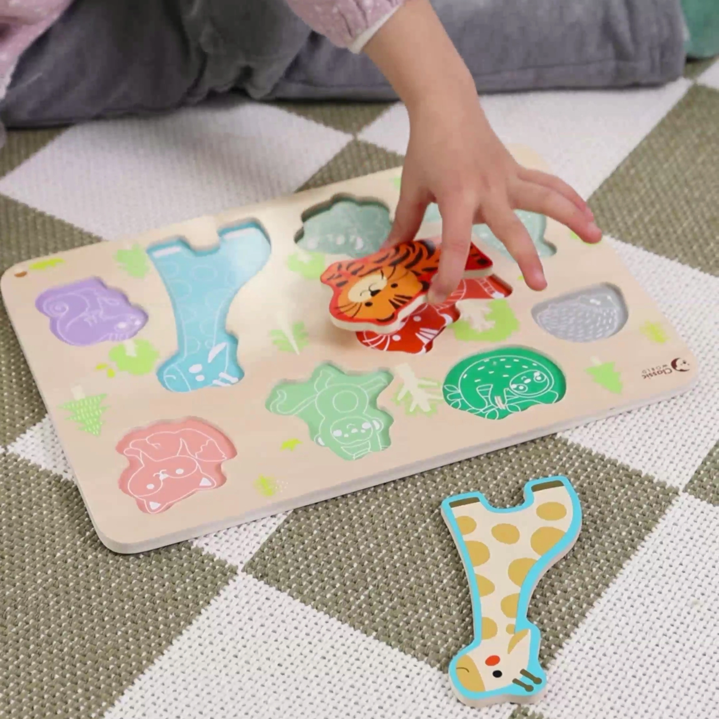 Spalvoti, gyvūnėlių formos elementai skatina vaikus dėlioti ir padeda lavinti smulkiąją motoriką bei akių–rankų koordinaciją jau nuo 18 mėnesių.