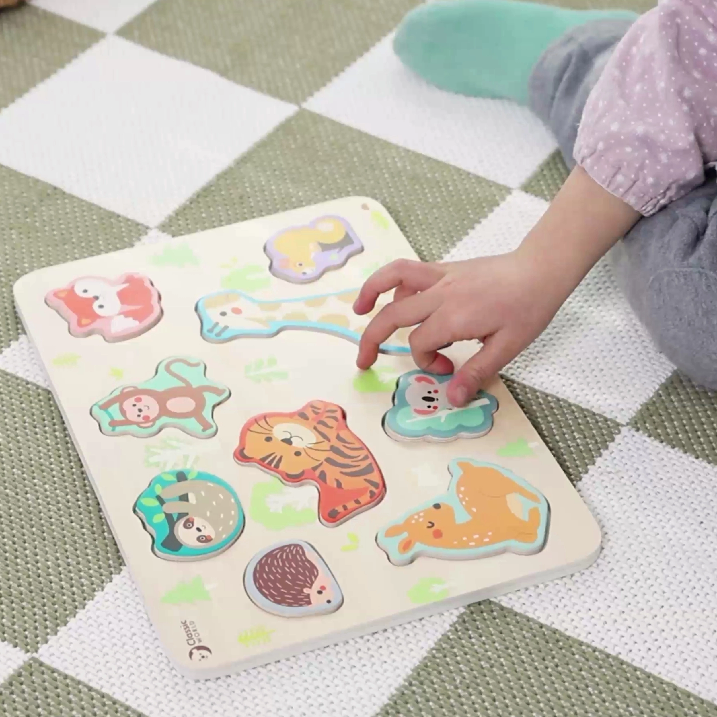 Atraskite linksmą medinę įmautę su gyvūnėliais iš CLASSIC WORLD, kuri vaikus nuo 18 mėnesių moko atpažinti formas ir spalvas. Spalvingi elementai, kaip žirafa ar lapė, įstatomi į atitinkamas angas lentoje, taip natūraliai lavinant smulkiąją motoriką, akių–rankų koordinaciją ir loginį mąstymą.