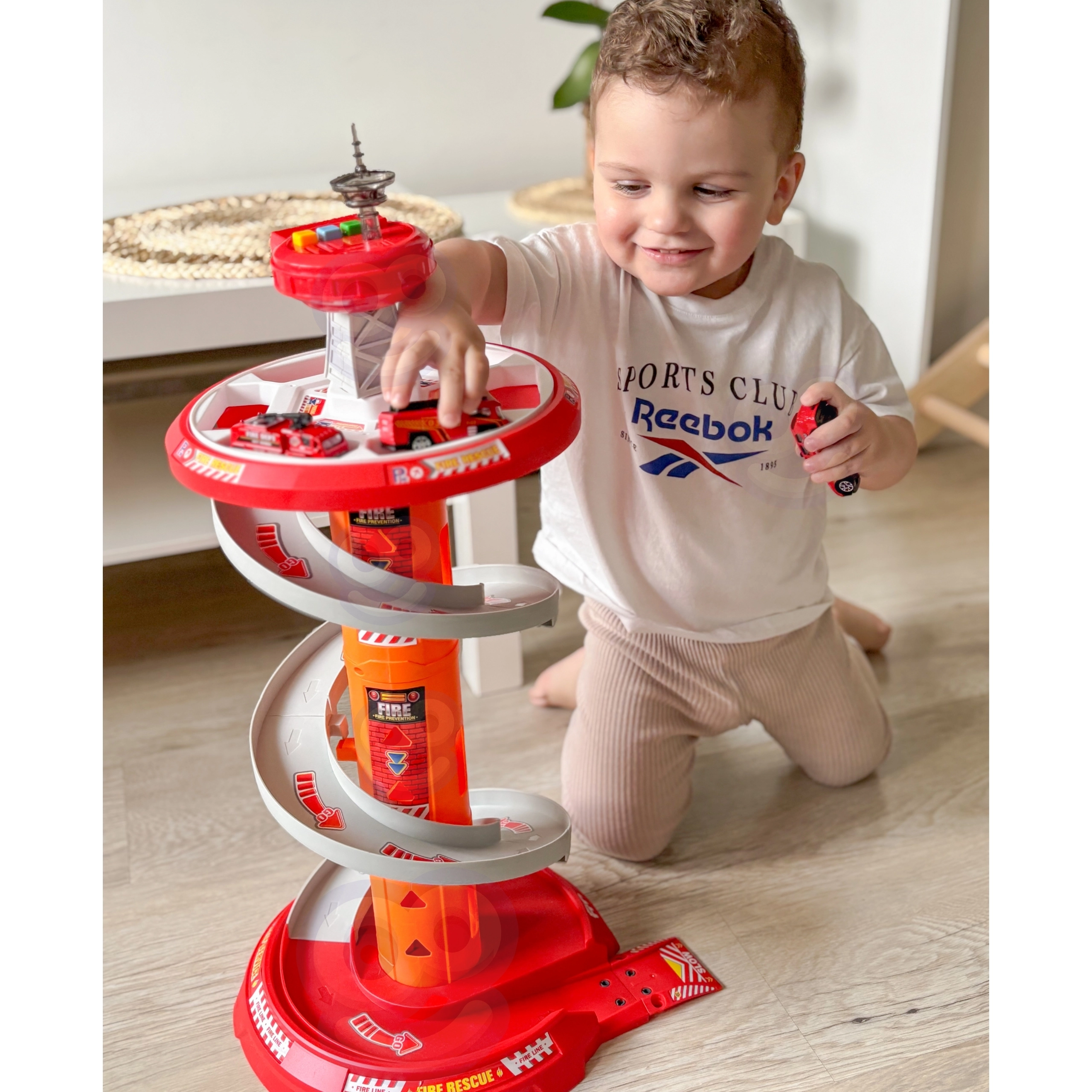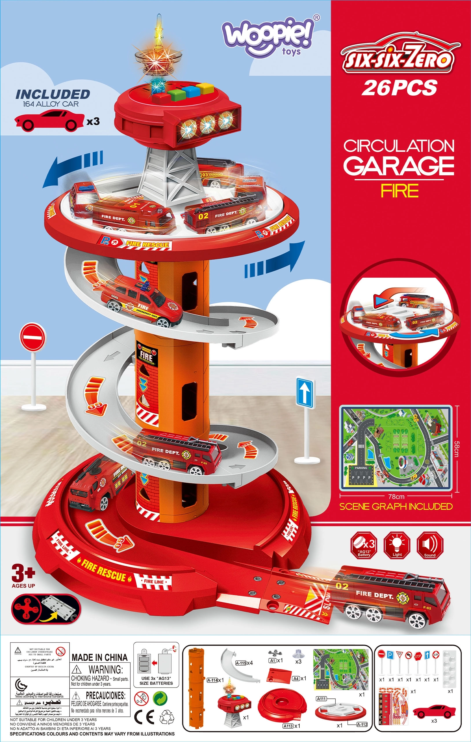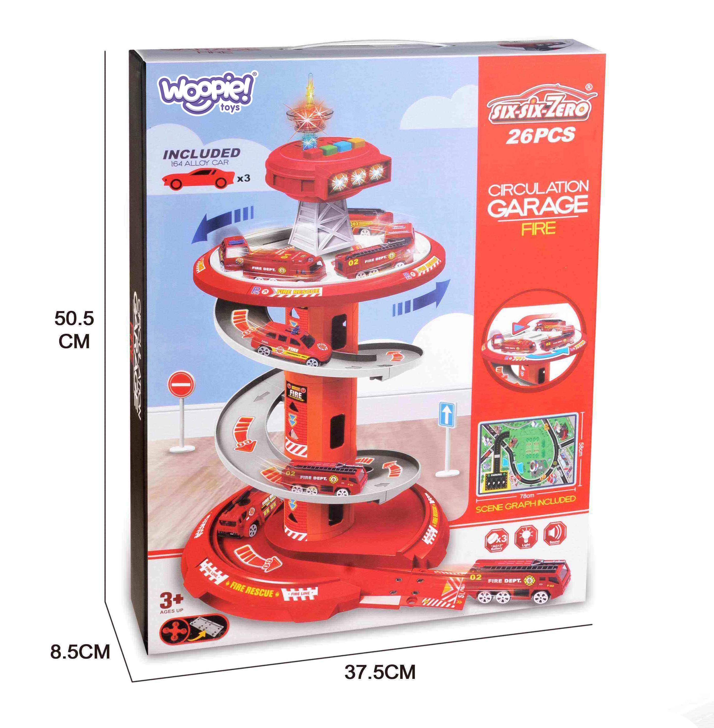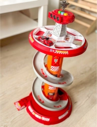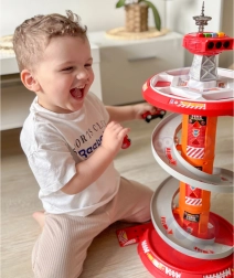 Smagus spiralinis parkavimas mažiesiems gaisrininkams iš WOOPIE siūlo daugiaaukštę trasą su greitu nusileidimu, šviesos ir garso efektais bei 3 gaisriniais automobiliukais. Vaikai nuo 3 metų mėgausis dinamišku važiavimu žiedine rampa, gelbėjimo vaidmenų žaidimu ir važiavimu pridėta kelio danga su ženklais.