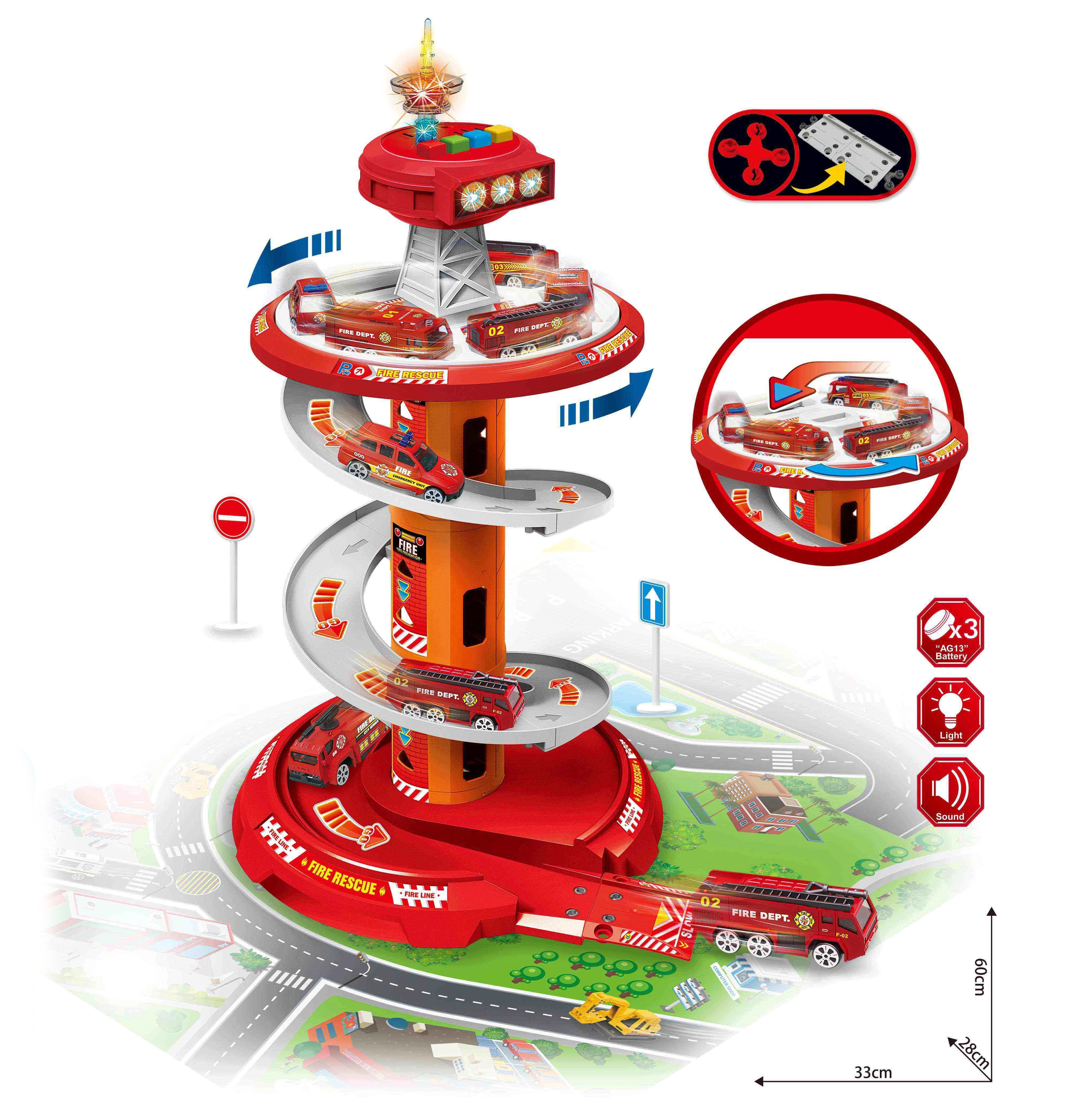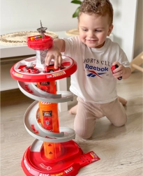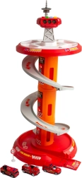 Žiedinė rampa užtikrina sklandų automobiliukų važiavimą iš aukščiausio aukšto iki bazės – idealiai tinka lenktynėms ir dinamiškoms gelbėjimo užduotims.