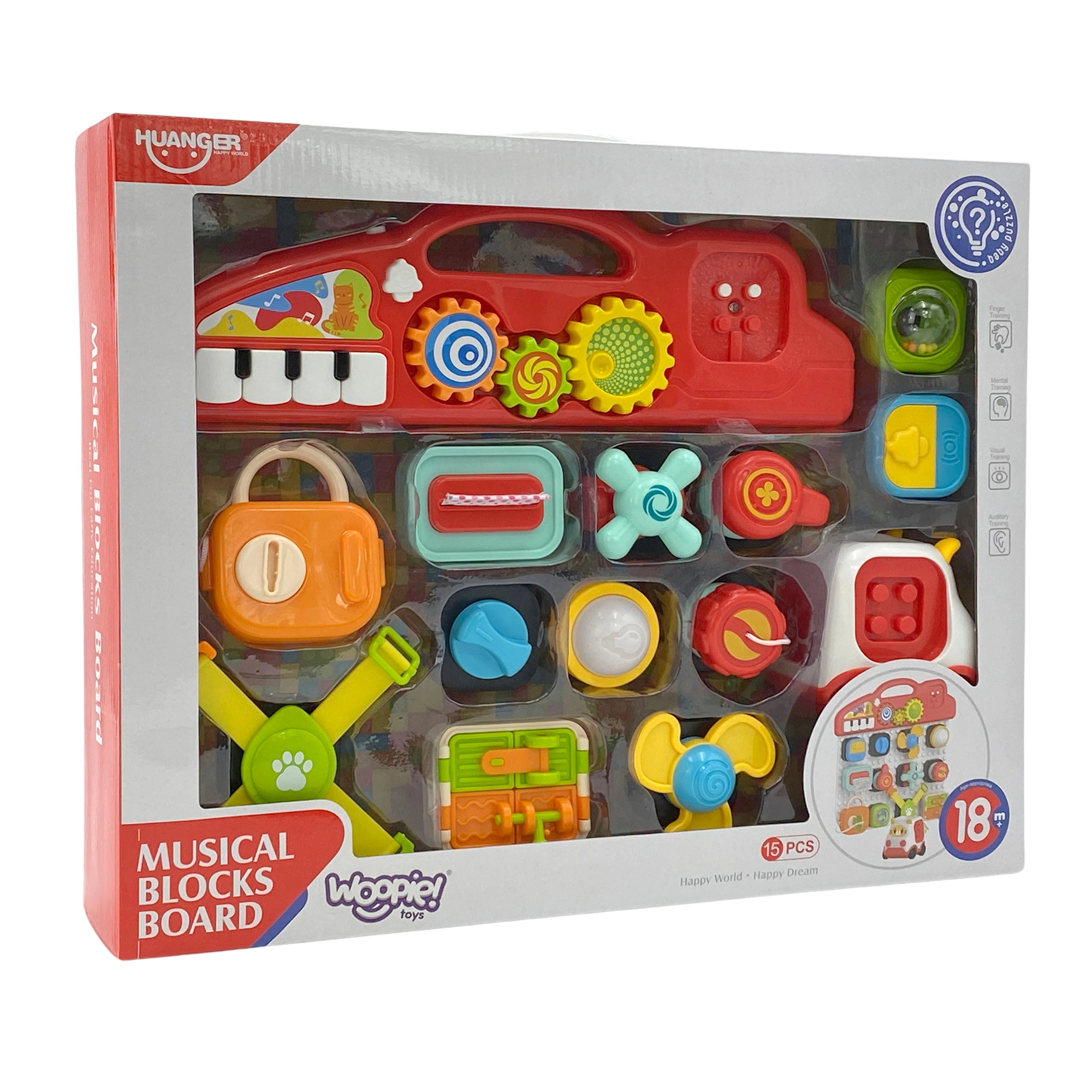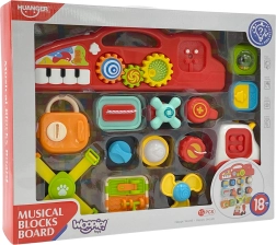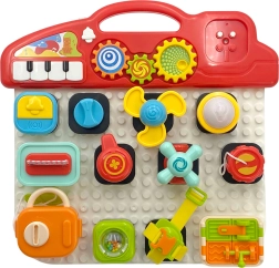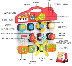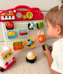 Spalvotame skydelyje yra įvairūs jungikliai, ratukai ir mygtukai, lavinantys smulkiąją motoriką.