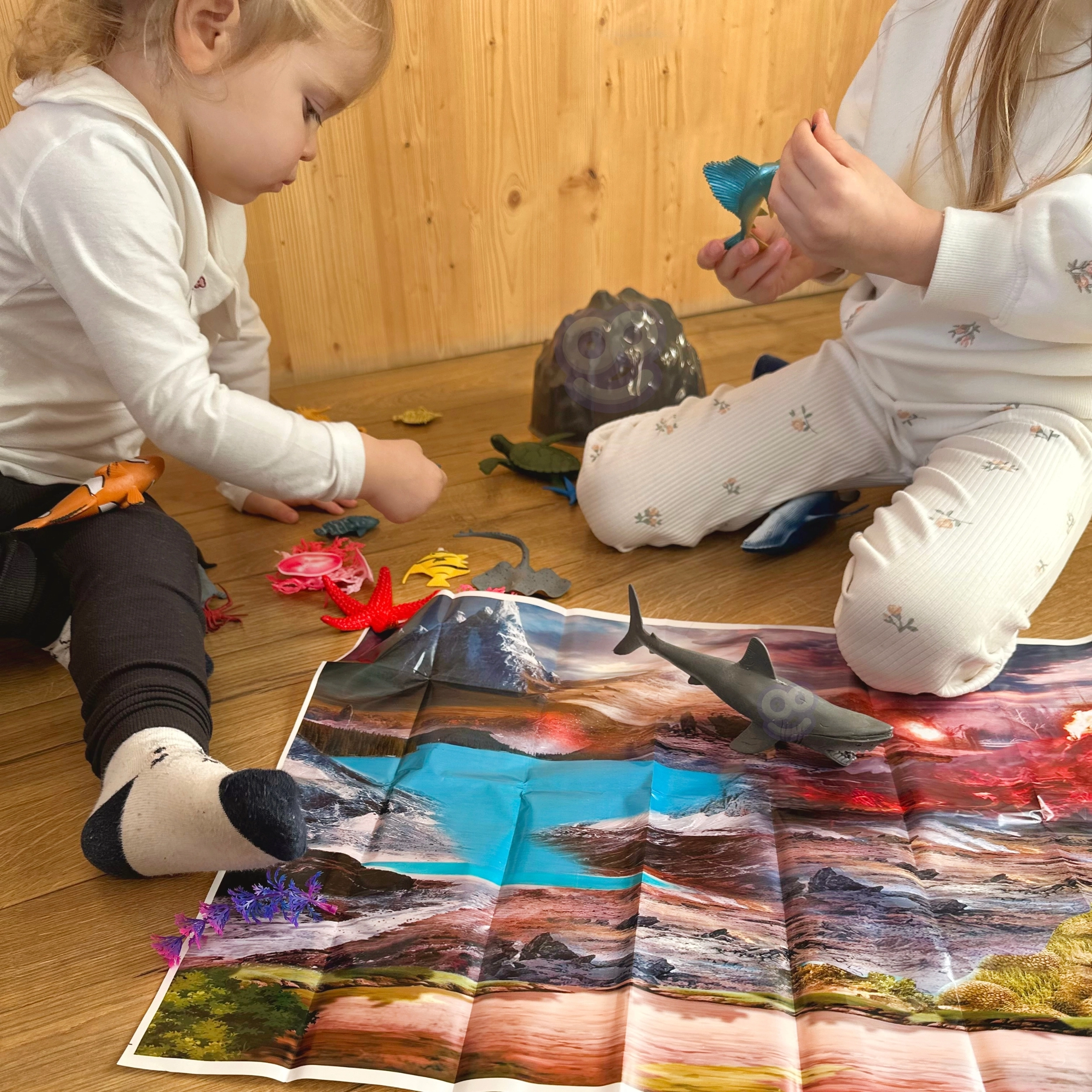 Į komplektą įeina žaidimų kilimėlis ir uolėtas elementas, kurie sukuria autentišką aplinką kūrybiškam ir įtraukiančiam žaidimui.