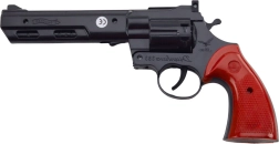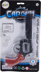 Atraskite klasikinį kapsulių revolverį, kuris pradžiugins mažus ir didelius vesternų gerbėjus. Dėl sukamojo būgnelio atrodo įtikinamai ir gali būti naudojamas su kapsulėmis arba be jų – kaip žaislas, rekvizitas ar kostiumo dalis. Juodas korpusas su raudona rankena suteikia autentišką išvaizdą ir patogų laikymą.