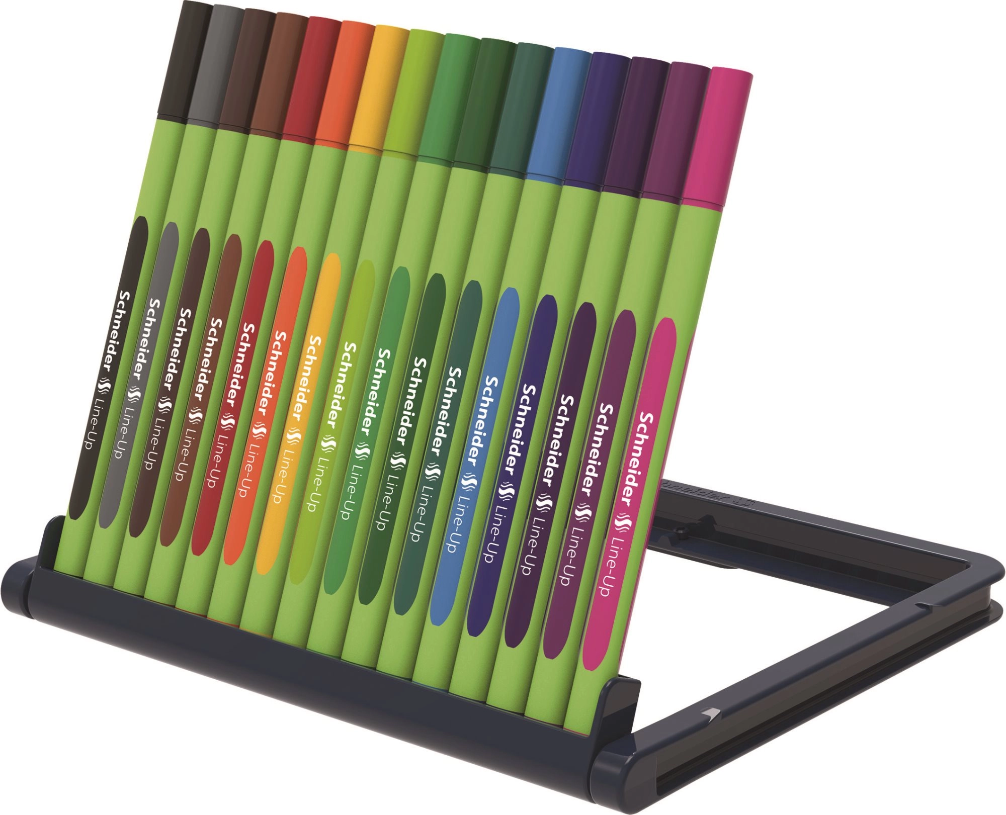 Atraskite kokybišką SCHNEIDER Line-Up žymeklių rinkinį su 16 intensyvių spalvų, skirtą tiksliam rašymui ir piešimui. Pluoštinis galiukas metaliniame vamzdelyje siūlo smulkų 0,4 mm brūkšnį, patogų gumuotą trikampį korpusą iš ekologiško bioplastiko ir dangtelius bei galinius antgalius užpildo spalvos, kad būtų lengva orientuotis.